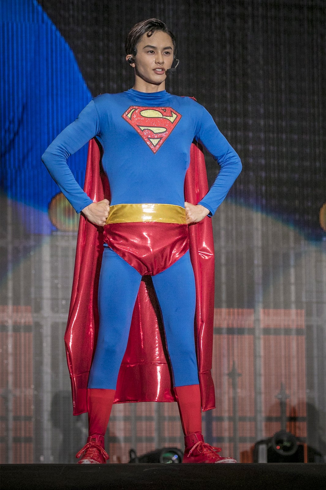 アメコミヒーローの仮装でのオープニング映像で会場の期待を高め、ユーキのみがセンターステージに登場。センターステージから6人がスタンバイするステージへ、花道を連続バク転して向かい歓声を起こした。ユーキの「盛りあがっていくぞー!」の声で始まった1曲目の自己紹介ソング「Superstar」では、キャラクターさながらに自己紹介。続く「Burn!」では、ユースケが「僕たちが代々木を守るぜー!」と声を上げ、ステージを走り回る。大サビの歌唱権もユースケが勝ち取り、熱唱後には「ひゃー!」とシャウトした。