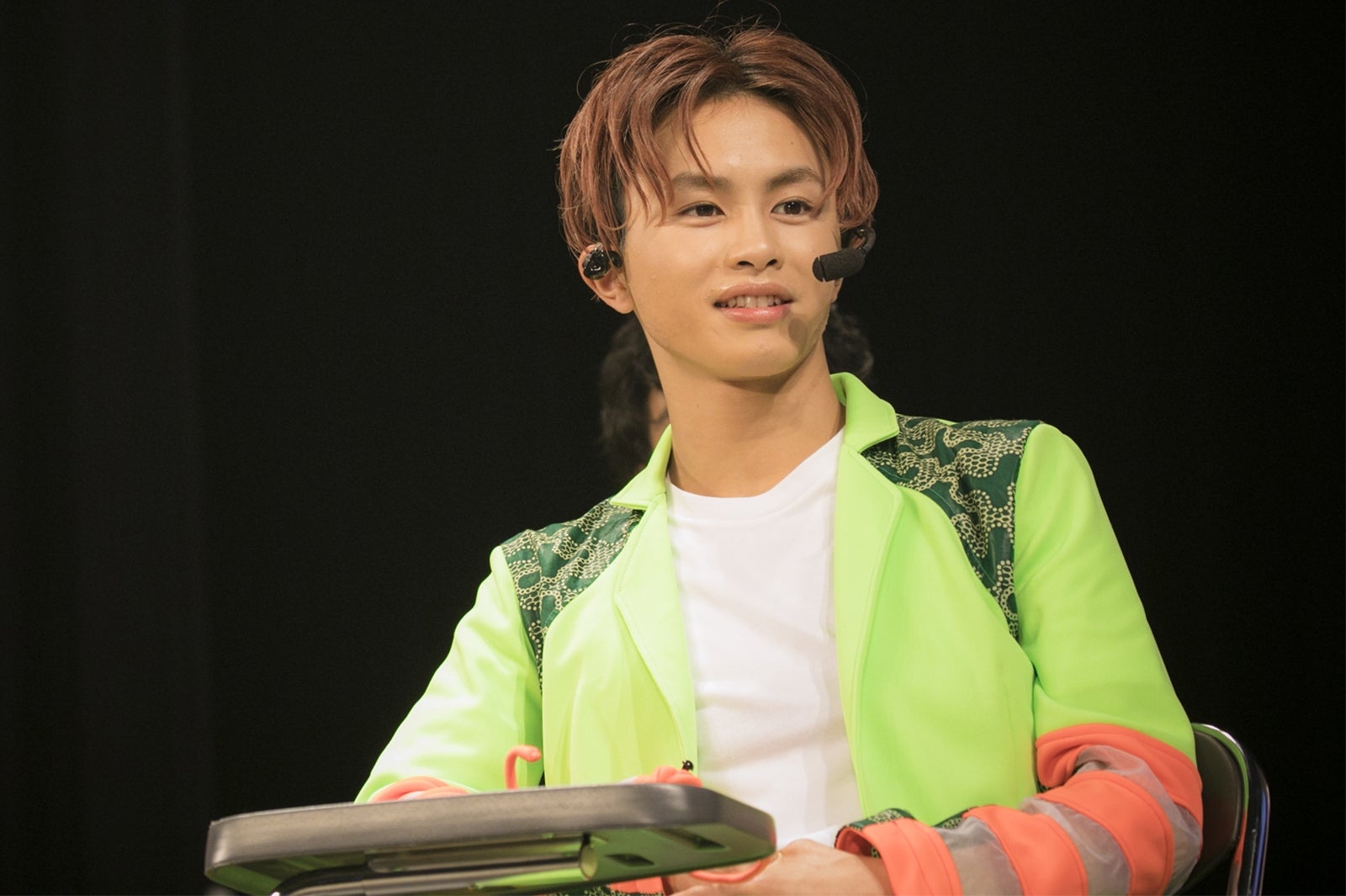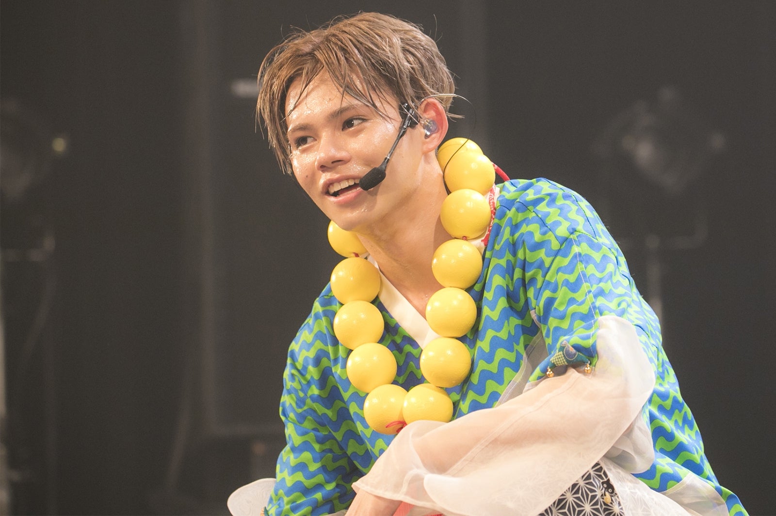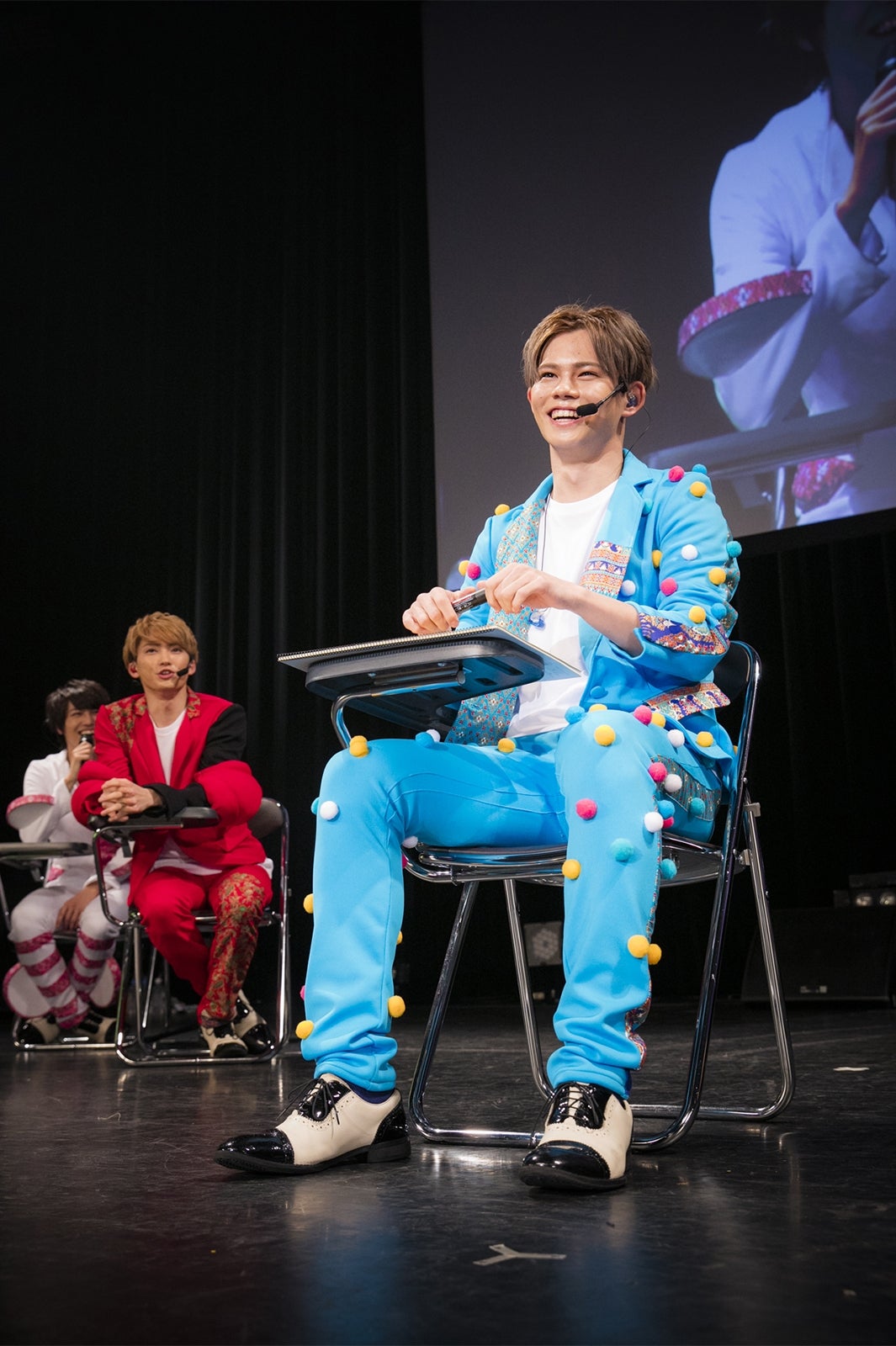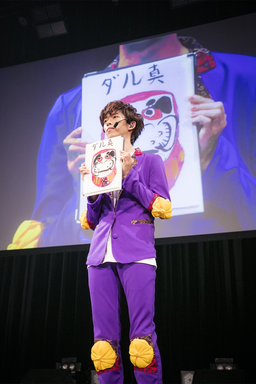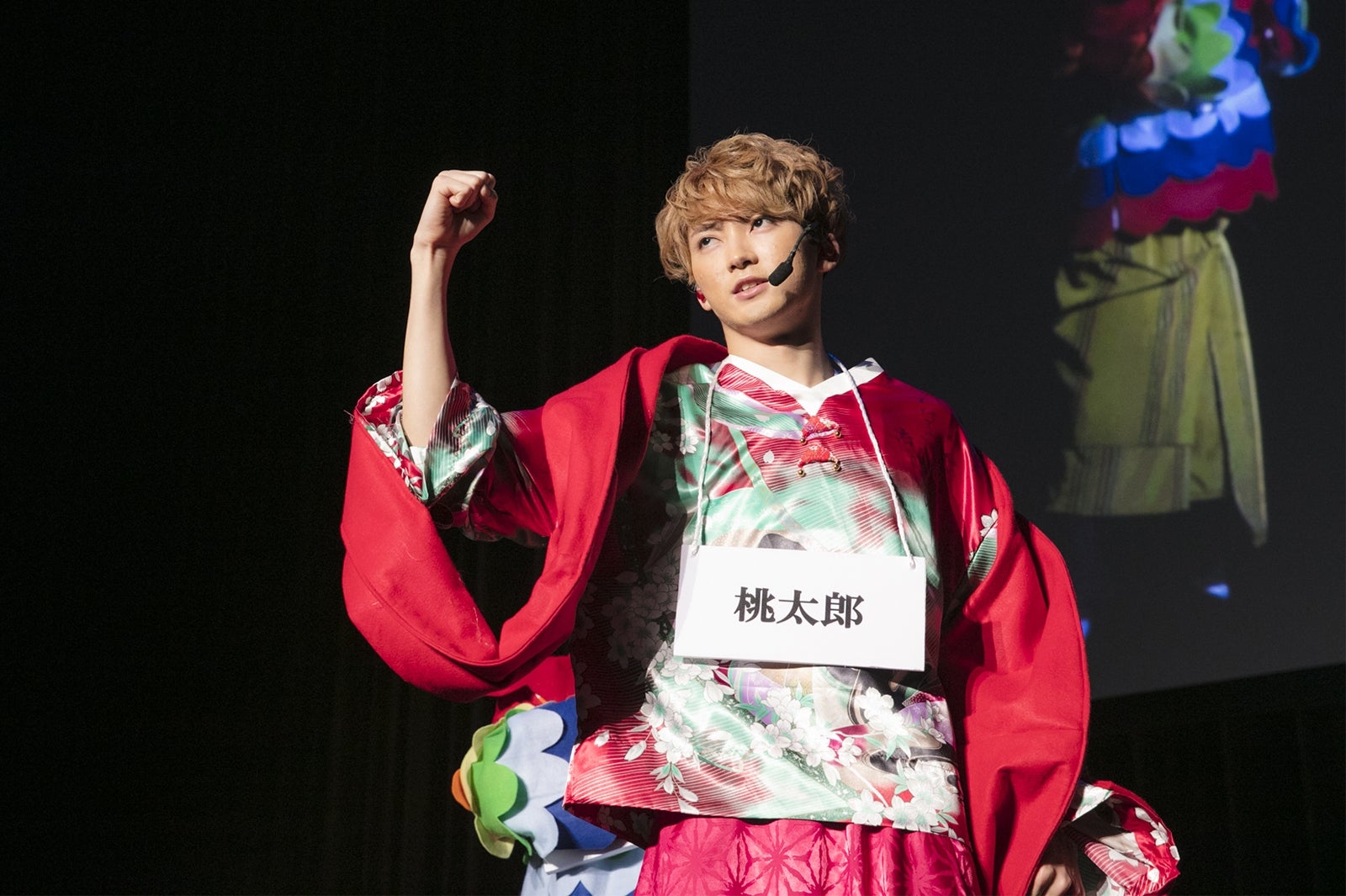 2部のトップバッター・リョウガが用意したのは、自慢のイケボで彼が「桃太郎」を読むのに合わせ、役を割り振られた他メンバーが演じるという絵本読み聞かせ企画。役になり切ったメンバーたちの個性あふれるパフォーマンスで笑いを誘った。タクヤのファッションチェックでは事前に募集した8号車の私服写真をスクリーンに映し出し、丁寧に批評とアドバイスをしてゆく。