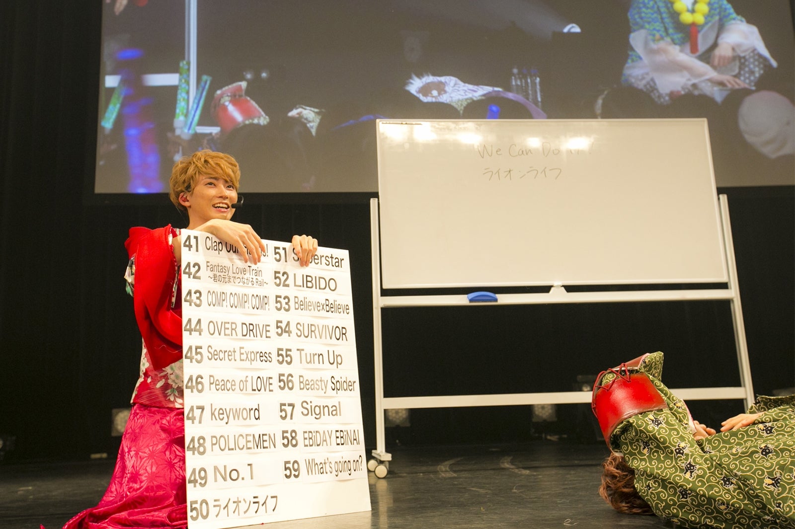 各部ともメンバーコーナー終了後にはライブが行われたが、くじ引きで選ばれた8号車がセットリストに入る曲を好きに選ぶという初の試みにより、メンバーもご無沙汰のナンバーが次々登場することに。カイいわく「楽屋で『SURVIVOR』『What going on?』『COMP!COMP!COMP!』『EBiDAY EBiNAI』の4曲は、来たらヤバいって話してた」とのことだが、「SURVIVOR」は1部で、残り3曲は2部で選ばれてしまい、曲が始まってもフォーメーションに迷ったり、歌詞を間違えたり、「わかんないよ!」と狼狽えながらダンスしたり、果ては即興でフリーダムに踊りだしたりと、普段は絶対に見られない姿で笑いと歓声の渦を巻き起こした。