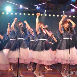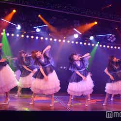 デニムブルゾンとチェックスカートのポップな衣装に身を包んだメンバーはそのまま『青くさいロック』『ランナーズハイ』『唇にBe My Baby』と激しいダンスナンバーを4曲続けてパフォーマンスし、開幕早々汗びっしょりに。