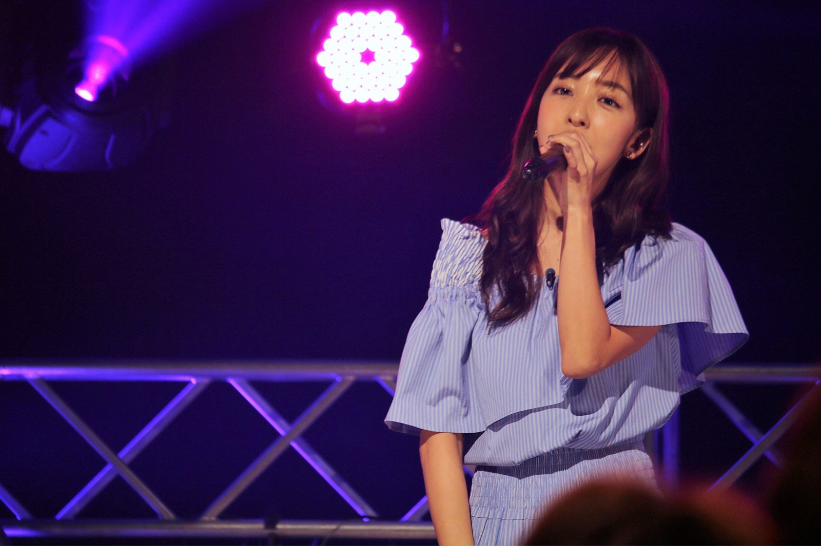 前髪を下ろしたヘアスタイルと、春らしい爽やかなストライプ柄ワンピースの新衣装で板野が登場し、昨年“おねだりダンス”で注目を浴びた「OMG(オーマイガー)」の歌唱でイベントがスタート。