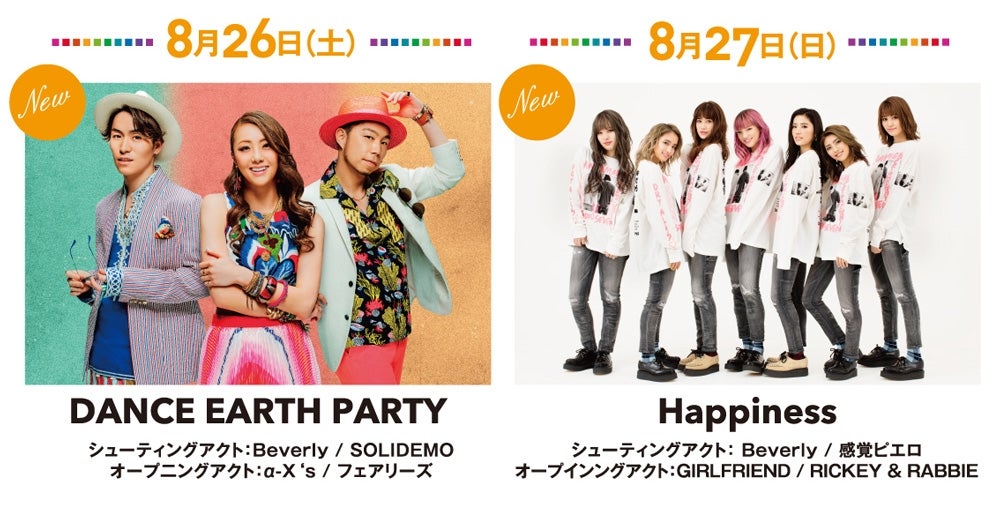 第2弾出演者として、8月26日(土)に初登場の3人組・ユニットDANCE EARTH PARTY、27日(日)にユニットでは初出演となるHappinessの出演が決定。