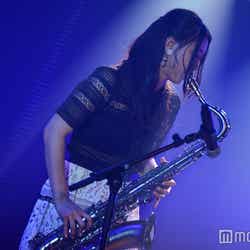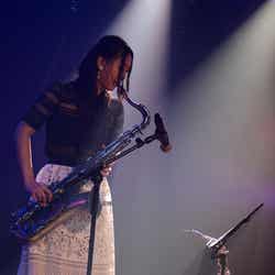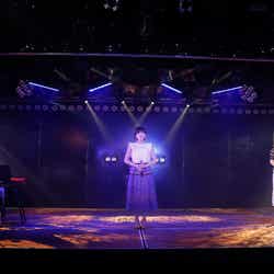中盤のユニットパートは、岡田(ボーカル)、竹内(ピアノ)、古畑(サックス)の生演奏による『泣きながら微笑んで』のパフォーマンスでスタート。自身でピアノアレンジした弾き語り動画を公開している竹内、SKE48のライブでもサックスを披露することがある古畑の堂々とした演奏に、岡田の安定感のある歌声が伸び伸びとのっかった。そのままボーカルに峯岸が加わり、今度はアップテンポの『Everyday、カチューシャ』を大胆にボサノバ風にアレンジしたバージョンで披露。古畑はサックスをアルトからテナーに持ち替え、劇場が一気に大人な雰囲気に包み込まれると、次は一転、峯岸の口上で着物姿の神志那が登場。元メンバーで演歌歌手の岩佐美咲の演歌『鯖街道』を情感たっぷりにカバーする。