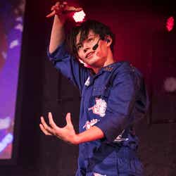 続いて最新シングル「My Buddy」では笑顔いっぱいのキュートな表情に8号車も色めき立ち、ユースケは「超芸人フェス!」と雄叫び。さらに感情が七変化する「ライオンライフ」にリョウガが白目を剥く「超えてアバンチュール」と、ライブ定番曲を序盤に固め打ちして、8号車を熱狂させる。ここで突然「HOT!HOT!」とリョウガが謎の動きをして、タクヤに「癇に障るからやめて」とどつかれるコントじみた展開から、今日ならではのコラボコーナーへ。まずはココリコが舞台に出ると、7人は「失礼のないように正装に着替えます」と宣言して、全員がつなぎの上から名前入りの白ブリーフを装着すれば場内は騒然。その理由を「僕ら、尊敬してやまないのが遠藤さんの“ホホホイダンス”なんです」とカイが述べて、ホホホイダンスに代わる動きにキレのあるギャグを披露するという『“超”新ギャグプレゼン大会』の開催を宣言する。