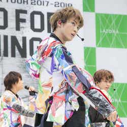 そんな中、「超ネバギバDANCE」のイントロで登場した7人。1曲目の「Super Star」はテンポのよいダンスで魅せるとともに、自己紹介パートでは、ステージ先端で思い思いにメッセージを発し、会場の熱を高めていった。2曲目に披露したのは、久しぶりの「POLICEMEN」。イントロが流れ出すとファンの歓喜の声が溢れ、曲中には警棒を持ってパフォーマンスする場面も。途中、ユーキが警棒を落としてしまう一幕もあったが、笑顔で乗り越えるとともに、タクヤがさり気なく拾い、ユーキへ手渡すという抜群のチームワークを見せた。