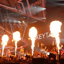 寺中友将(Vo/Gt)と八木優樹(Dr)がアニメ『クレヨンしんちゃん』の扮装で登場し、観客の心を笑いでつかむと、『Love me』でライブがスタートし、オーディエンスのクラップとともに『Summer Venus』へ。2017年はKEYTALKにとって、全国ツアーの開催や横浜アリーナでのワンマンライブと、飛躍の年だったという。そんな今年の6月に出演した『ミュージックステーション』で披露した楽曲『黄昏シンフォニー』を、「また出たいという想いを込めて」(小野)アリーナに届ける。続く『MATSURI BAYASHI』を、ダンサーを引き連れ派手に送りだすと、ラスト『MONSTER DANCE』へ突入。ステージ上では火柱噴射やテープ入りバズーカ砲の派手な演出でさらにアリーナを盛り上げ、次につなげる。THE ORAL CIGARETTES