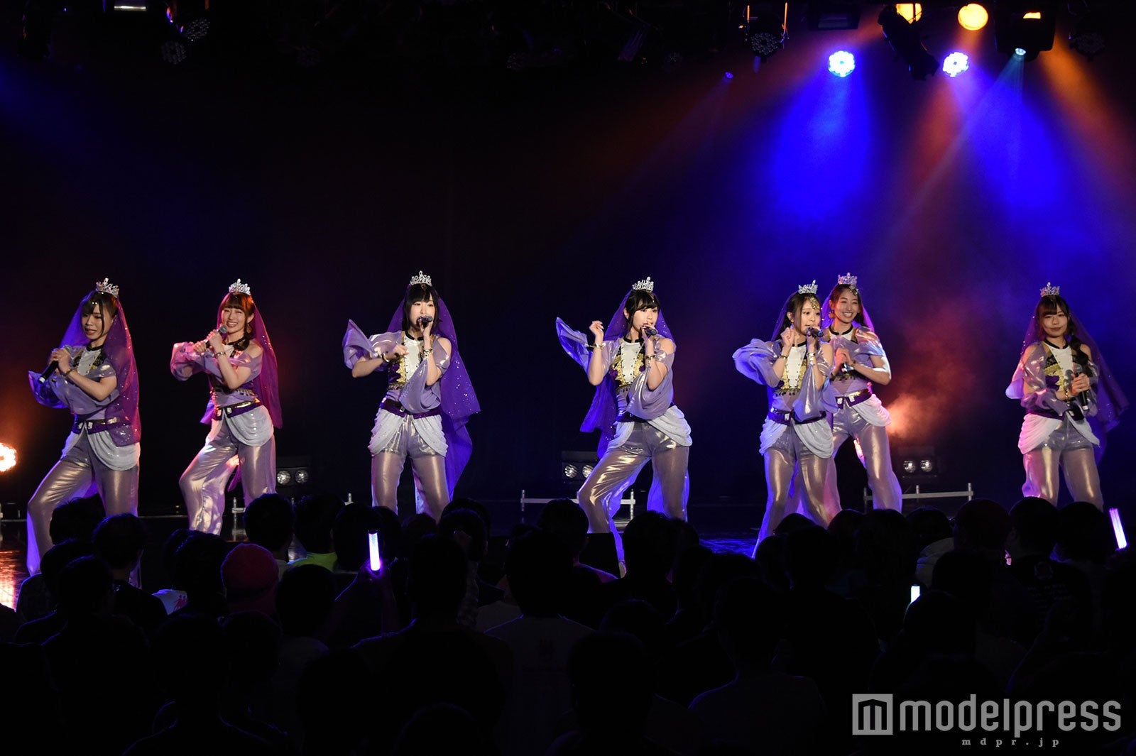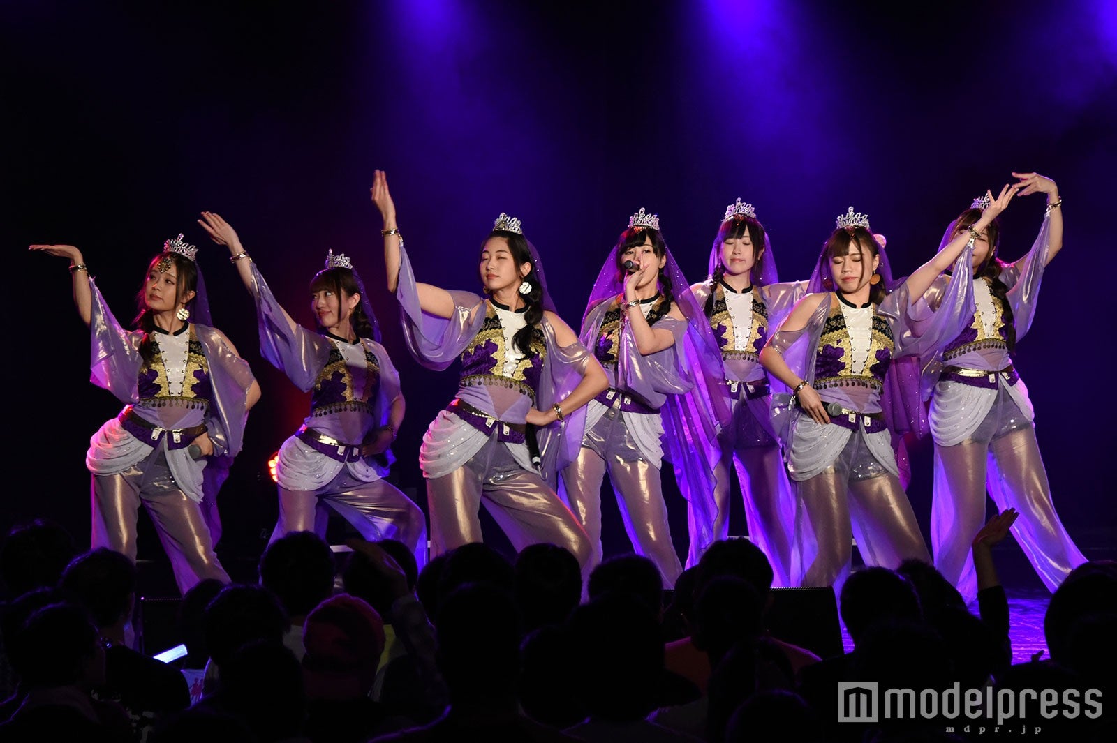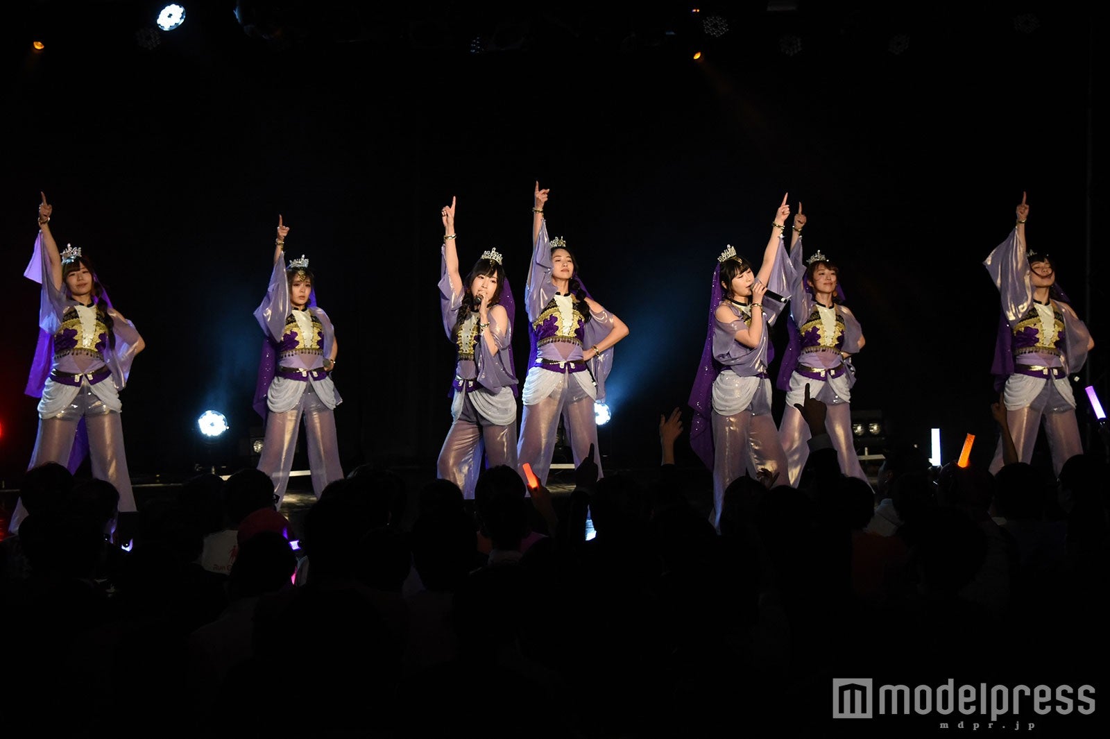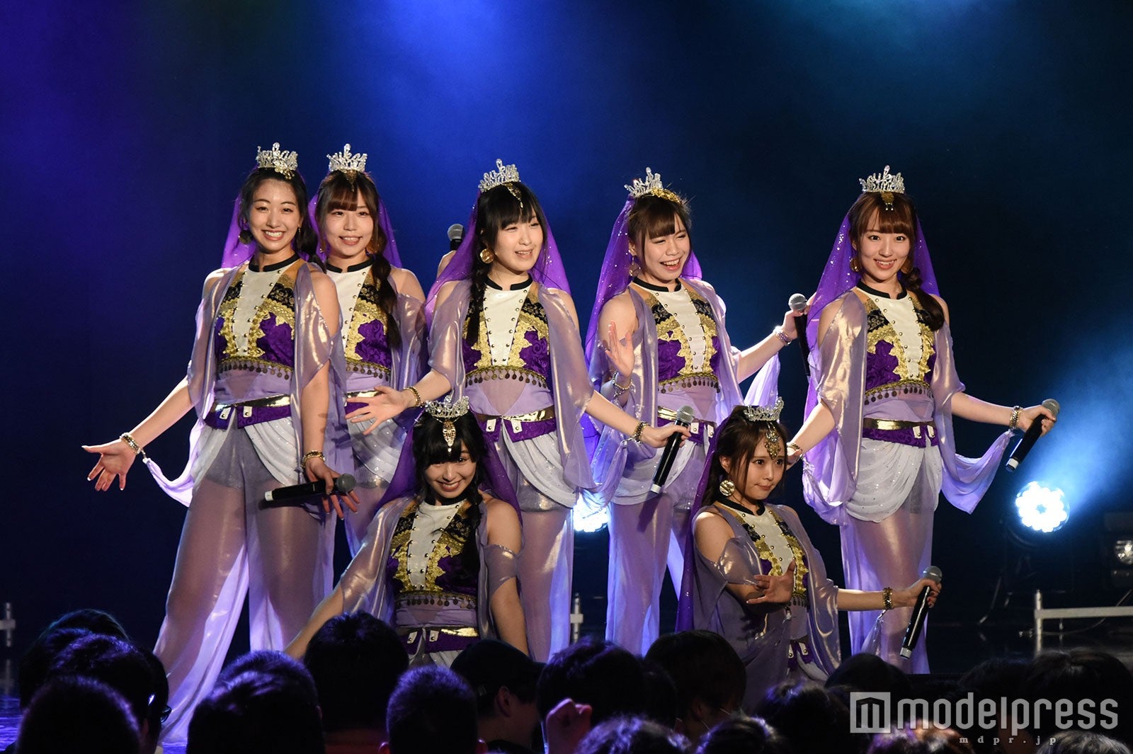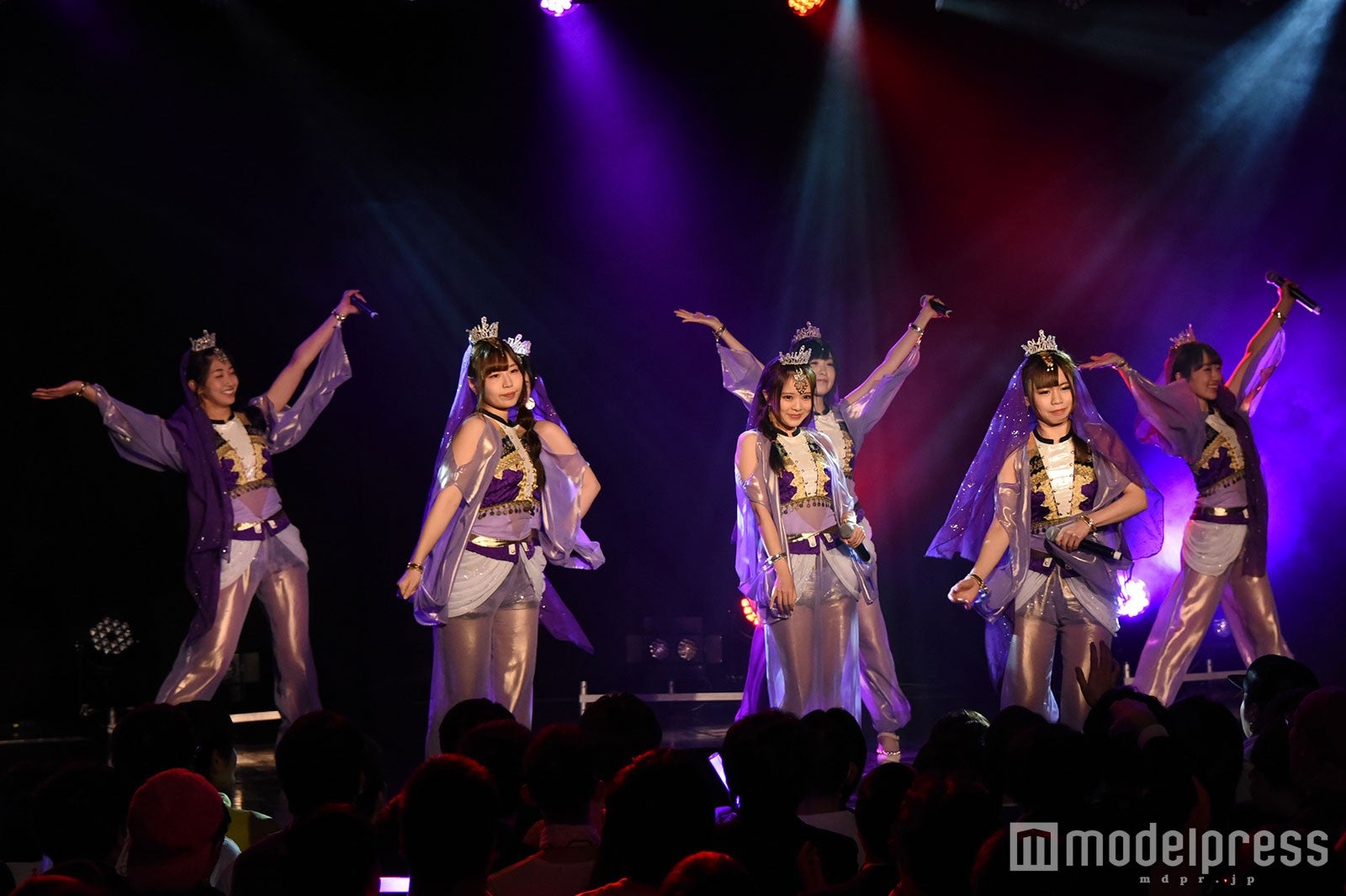 7組中の中盤、4組目に登場したのは、放課後プリンセス。1曲目の初めに「みなさん、盛り上がっていますか!」と会場を煽り、一気に雰囲気を自分たちのものに。放課後プリンセスは、16時を境にしてカチューシャはティアラへ、制服衣装はプリンセス衣装へ変わる学園アイドル。イベントは16時以降の夜の時間に行われたが、この日は、キラキラのプリンセス衣装ではなく、パープルのベールをまとったアラビアのプリンセスをイメージした衣装で登場。12月20日発売の新曲『アブラカタブLuv!』を披露し、新たな魅力でファンを虜にした。