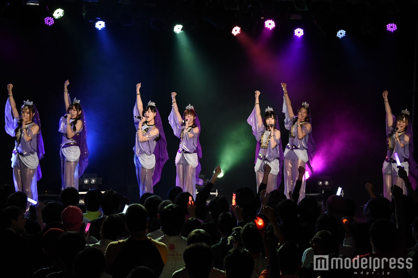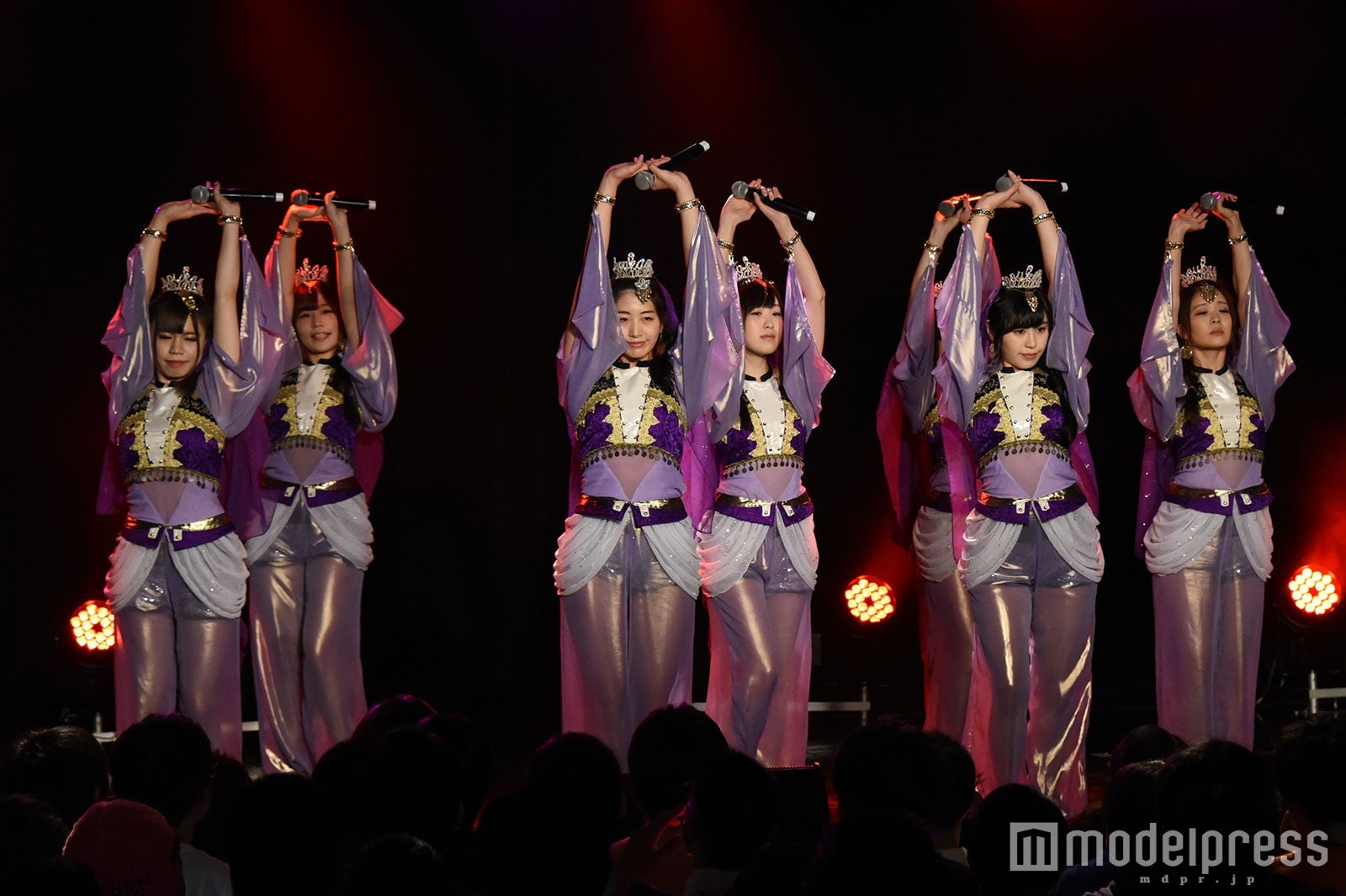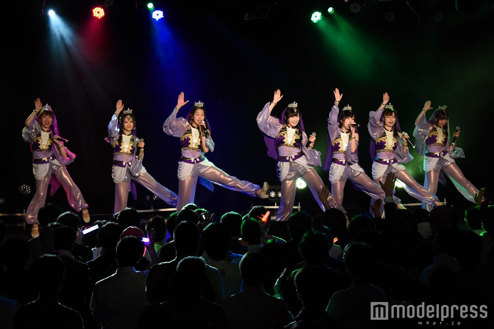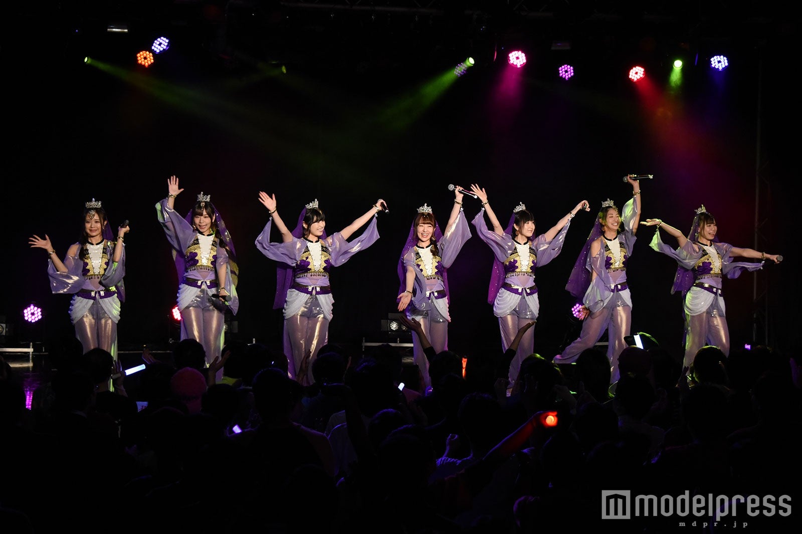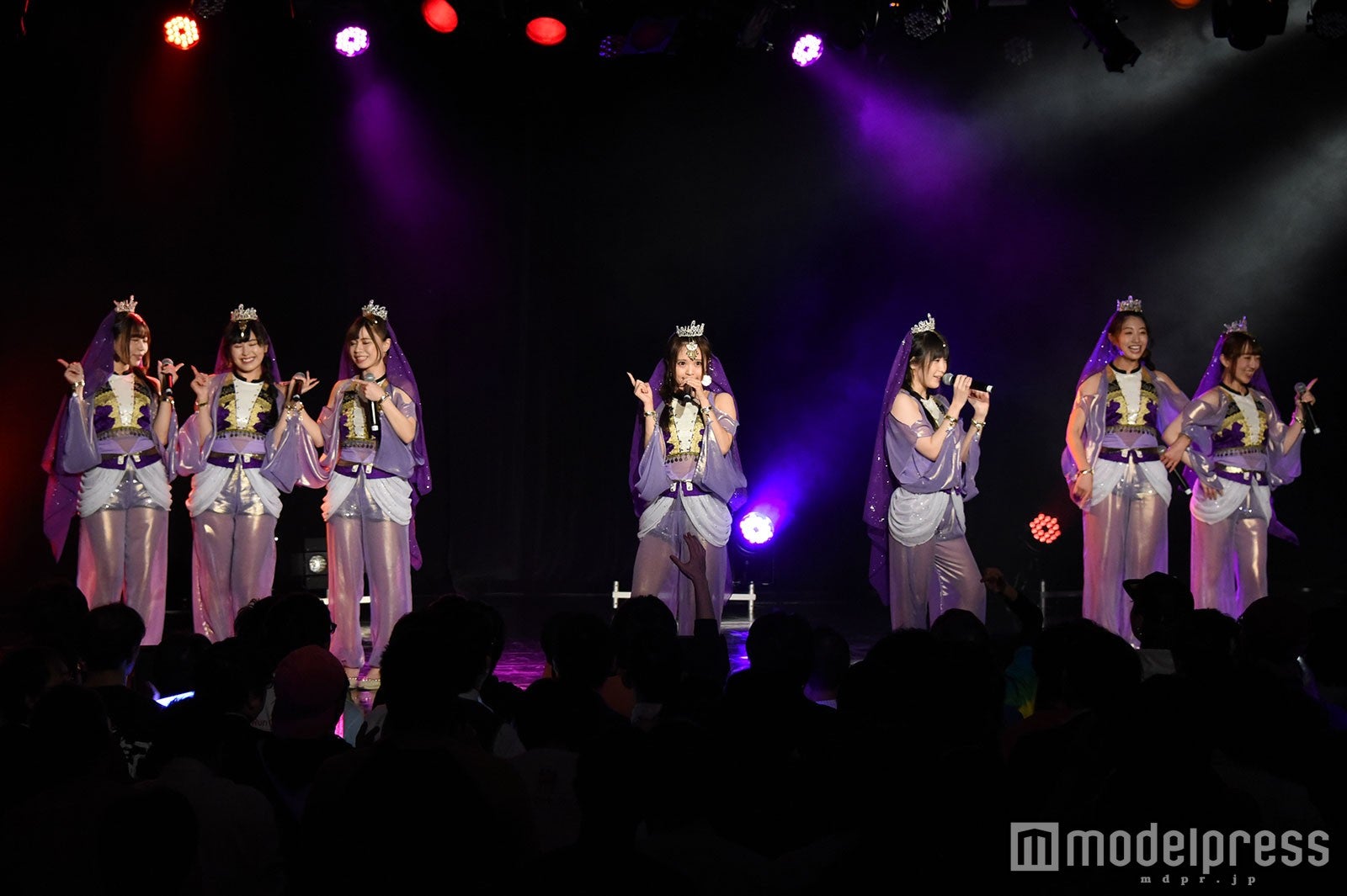 7組中の中盤、4組目に登場したのは、放課後プリンセス。1曲目の初めに「みなさん、盛り上がっていますか!」と会場を煽り、一気に雰囲気を自分たちのものに。放課後プリンセスは、16時を境にしてカチューシャはティアラへ、制服衣装はプリンセス衣装へ変わる学園アイドル。イベントは16時以降の夜の時間に行われたが、この日は、キラキラのプリンセス衣装ではなく、パープルのベールをまとったアラビアのプリンセスをイメージした衣装で登場。12月20日発売の新曲『アブラカタブLuv!』を披露し、新たな魅力でファンを虜にした。