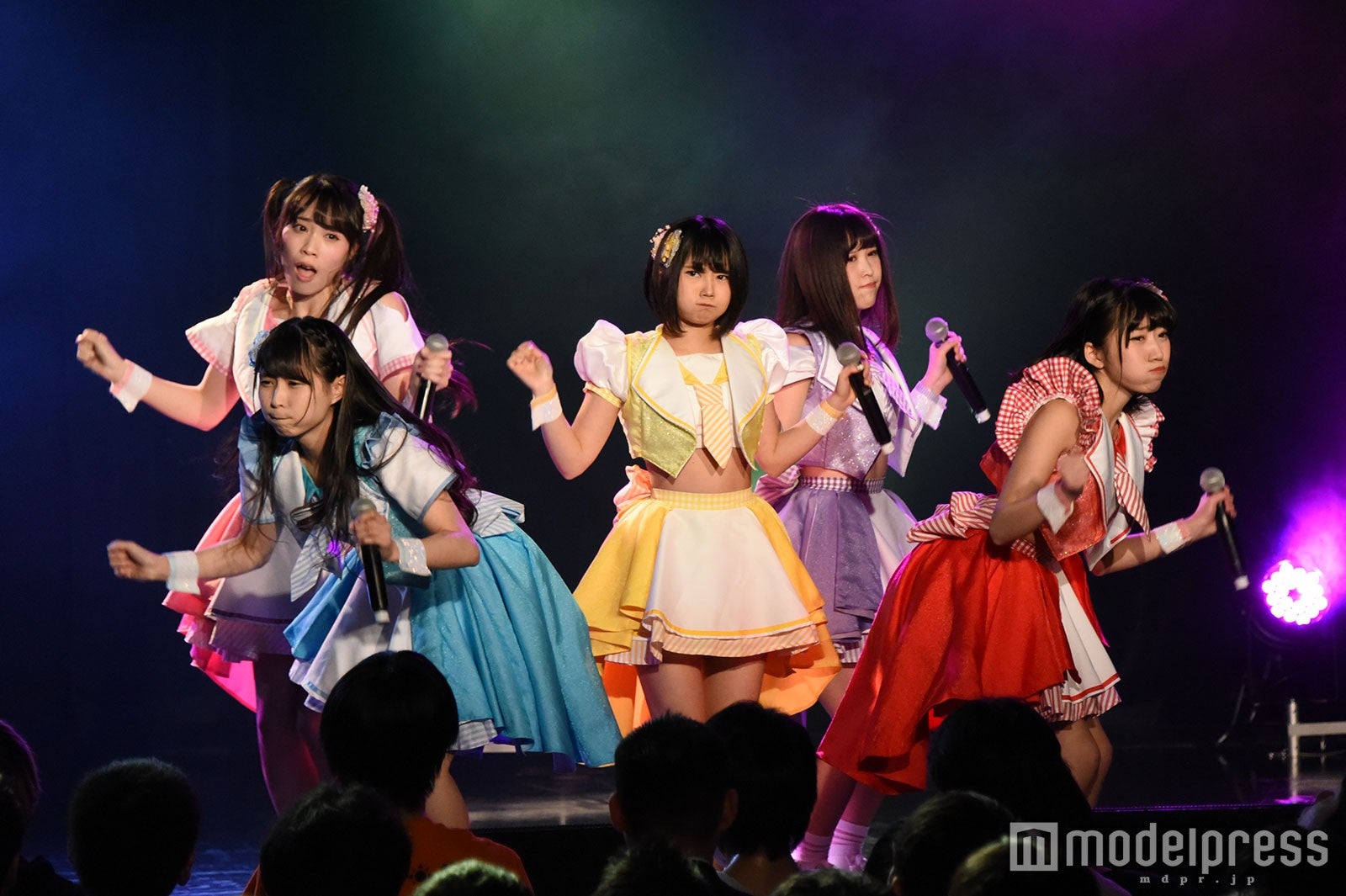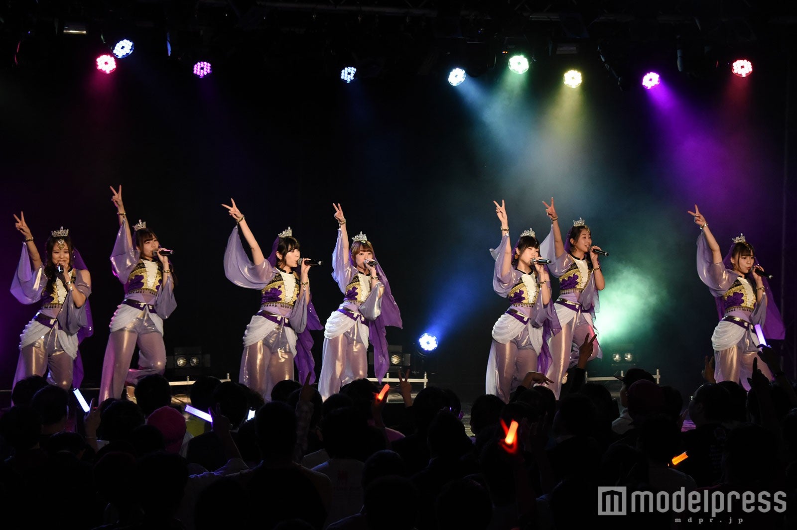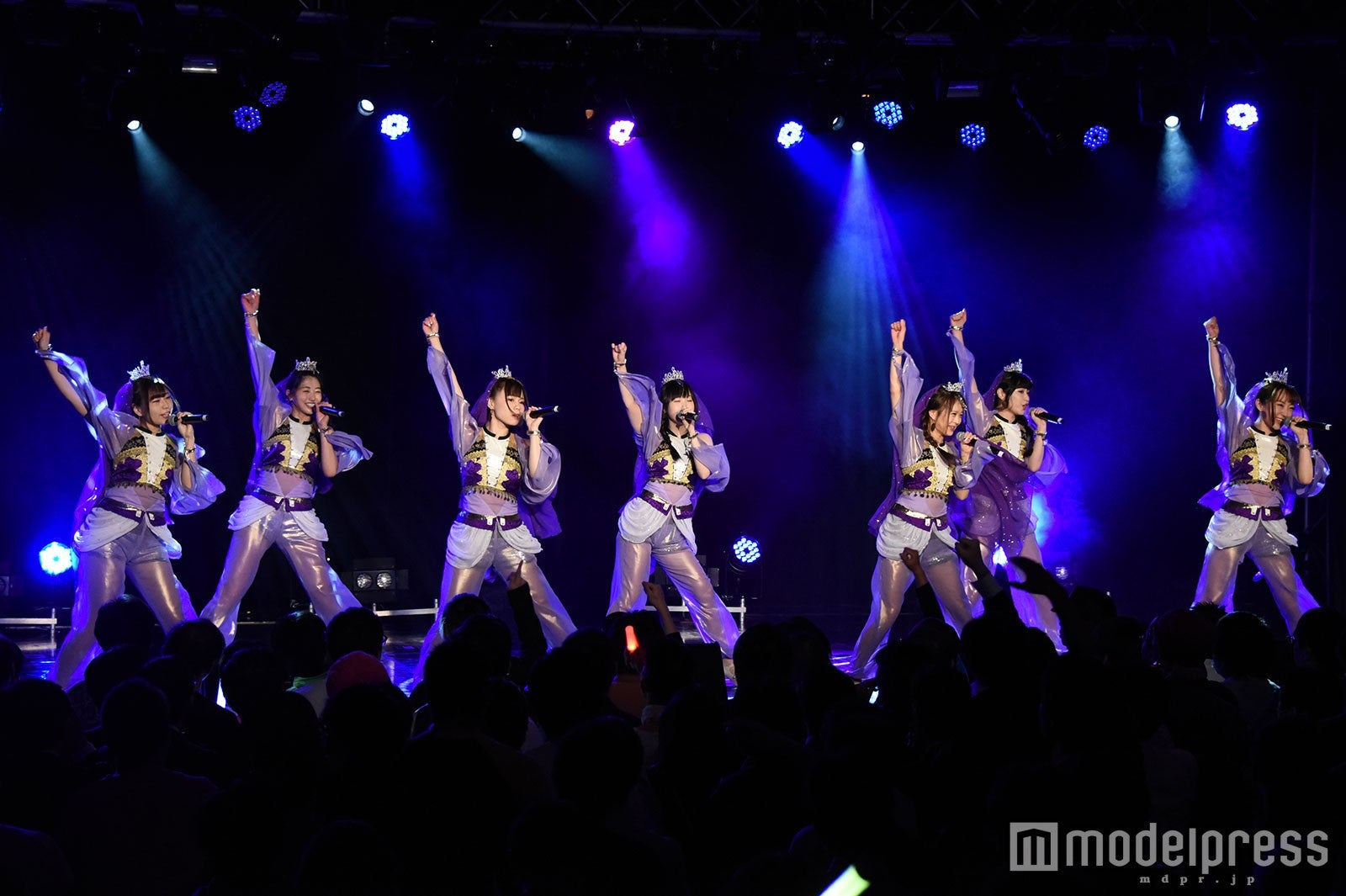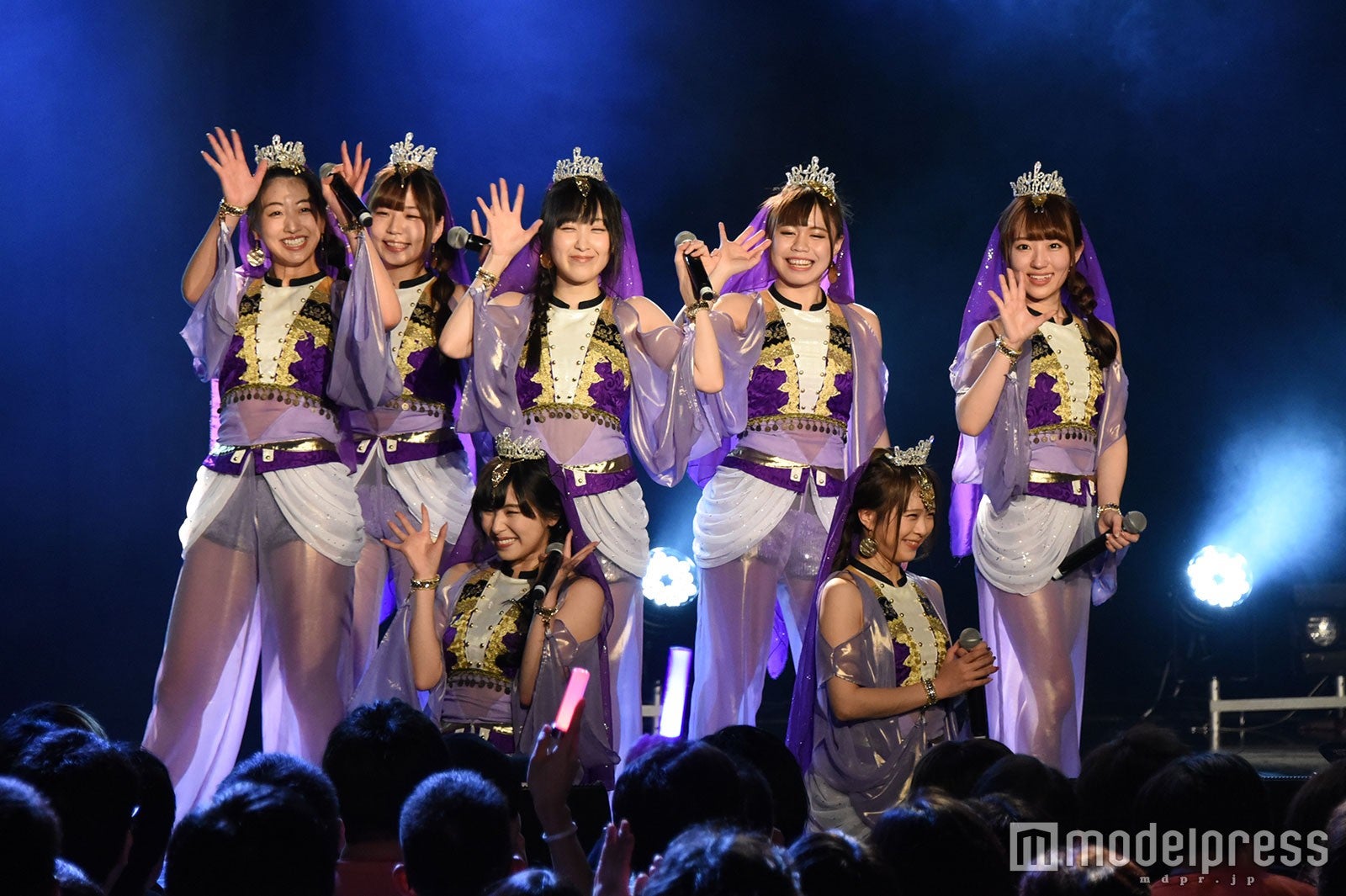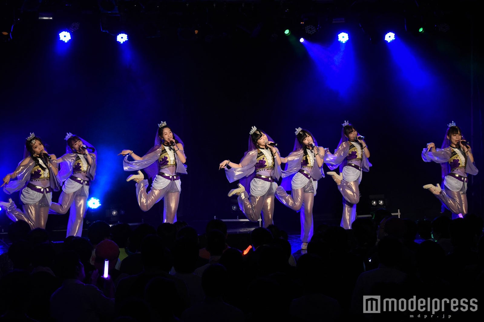 7組中の中盤、4組目に登場したのは、放課後プリンセス。1曲目の初めに「みなさん、盛り上がっていますか!」と会場を煽り、一気に雰囲気を自分たちのものに。放課後プリンセスは、16時を境にしてカチューシャはティアラへ、制服衣装はプリンセス衣装へ変わる学園アイドル。イベントは16時以降の夜の時間に行われたが、この日は、キラキラのプリンセス衣装ではなく、パープルのベールをまとったアラビアのプリンセスをイメージした衣装で登場。12月20日発売の新曲『アブラカタブLuv!』を披露し、新たな魅力でファンを虜にした。