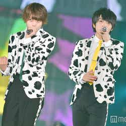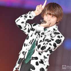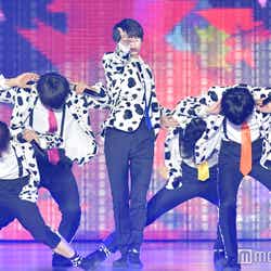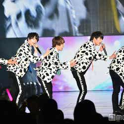 オープニングアクトとして登場したM!LK。牛柄衣装に身を包んだメンバーがステージに現し、『テルネロファイター』でライブスタート。ランウェイステージにメンバーが歩き出すと、会場の“み!るきーず”(M!LKのファン)は大興奮でステージに駆け寄り、ペンライトを揺らした。板垣瑞生が「トレンディ女子の皆さん、どうも!業界大注目のM!LKです!」と茶目っ気たっぷりに挨拶。佐野勇斗は「皆さん、俺が『佐野に』って言ったら申し訳ないんですけど、『キュンキュン!』って言ってもらっていいですか?!」と自己紹介で笑いを誘った。