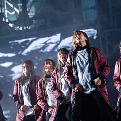 オープニング1曲目を飾った最新6thシングル『ガラスを割れ!』では、イベントやテレビでもグループを引っ張ってきた“ゆいちゃんず”今泉佑唯と小林由依がWセンターに。メンバーは、お馴染みの黒のパンツとMA-1の衣装を身にまとったが、その色に注目が集まった。同曲の衣装は、アーティスト写真やミュージックビデオでは、センターの平手のみが赤、ほかのメンバーが黒のMA-1。しかし、今回のステージでは、全員が赤のMA-1バージョンで歌唱。