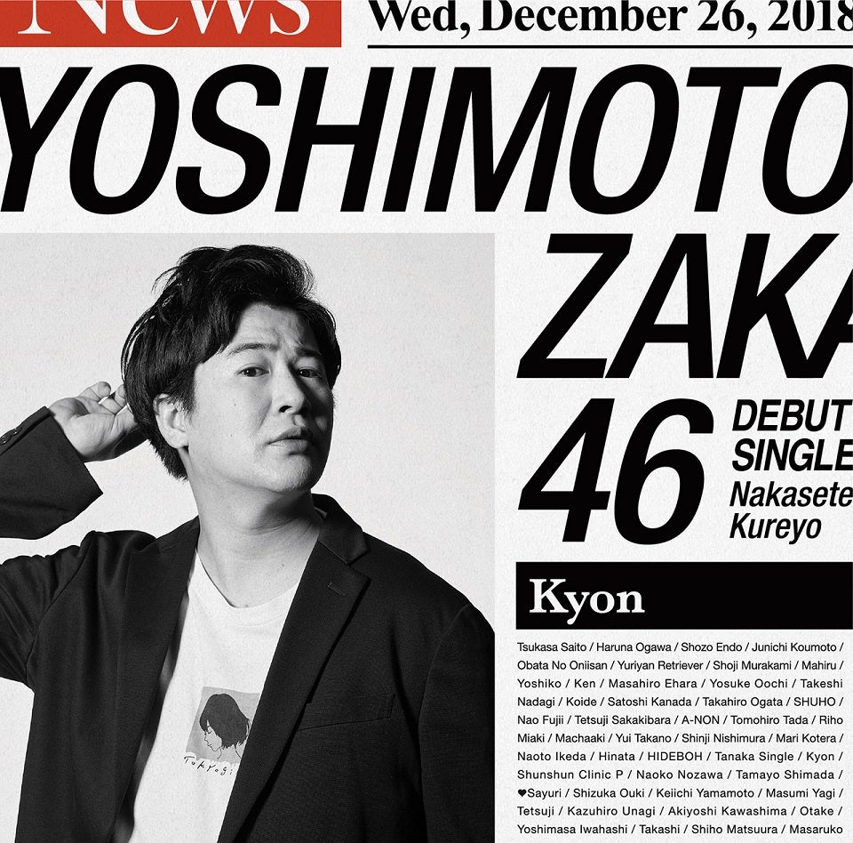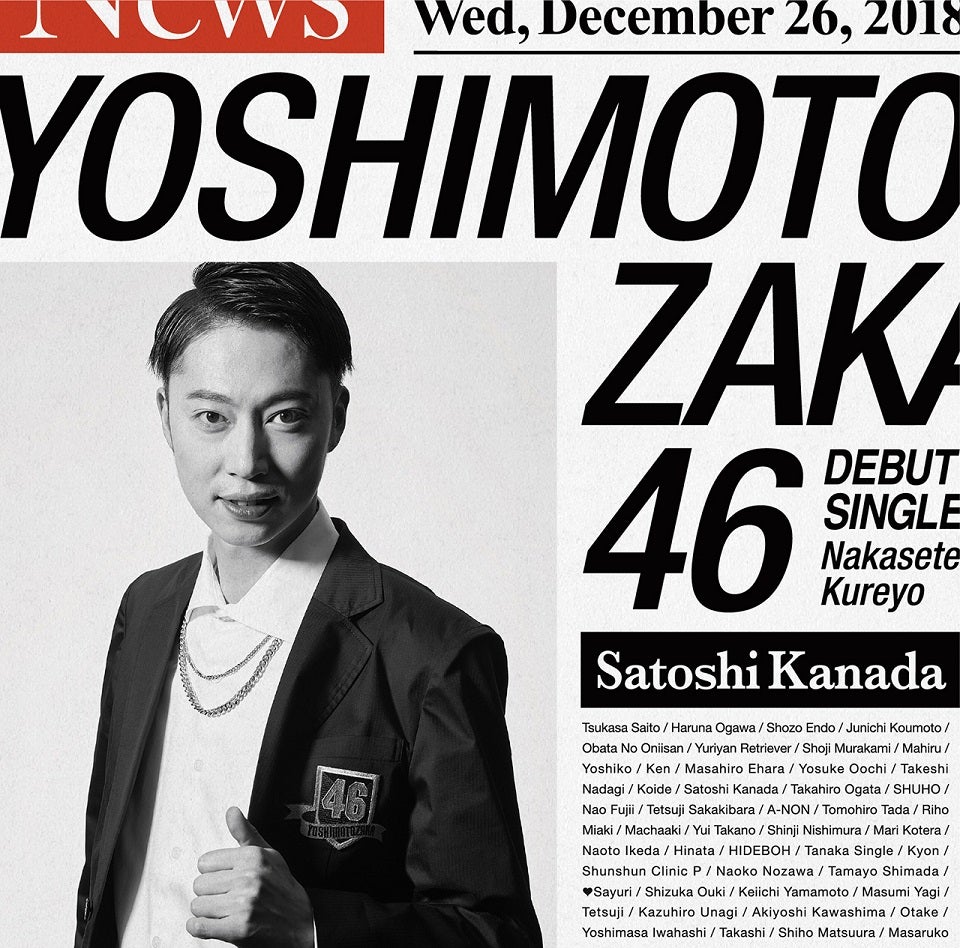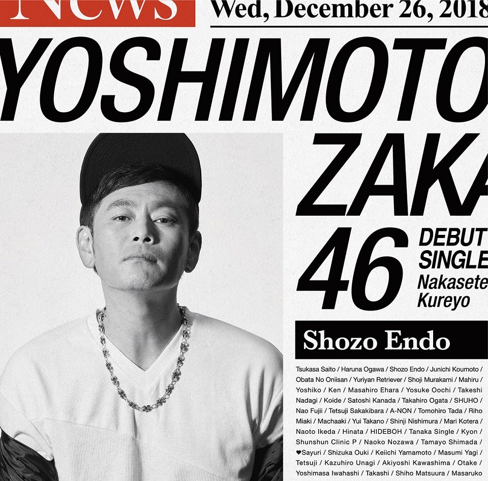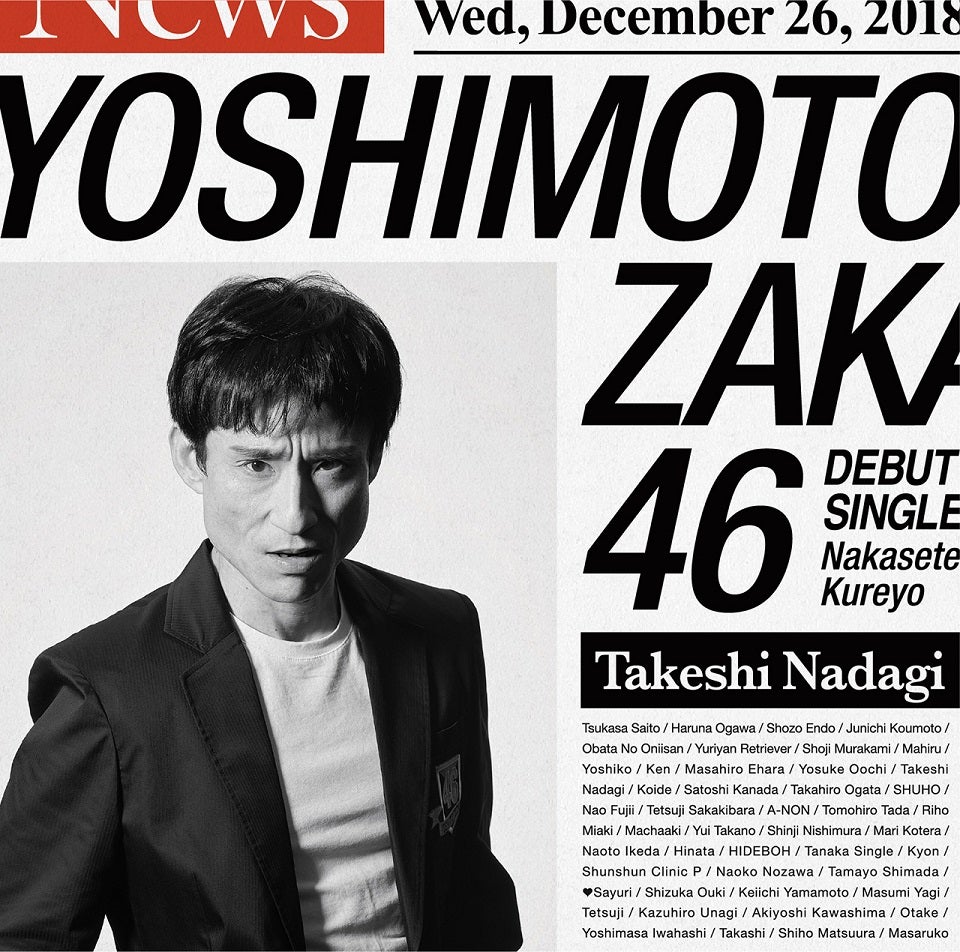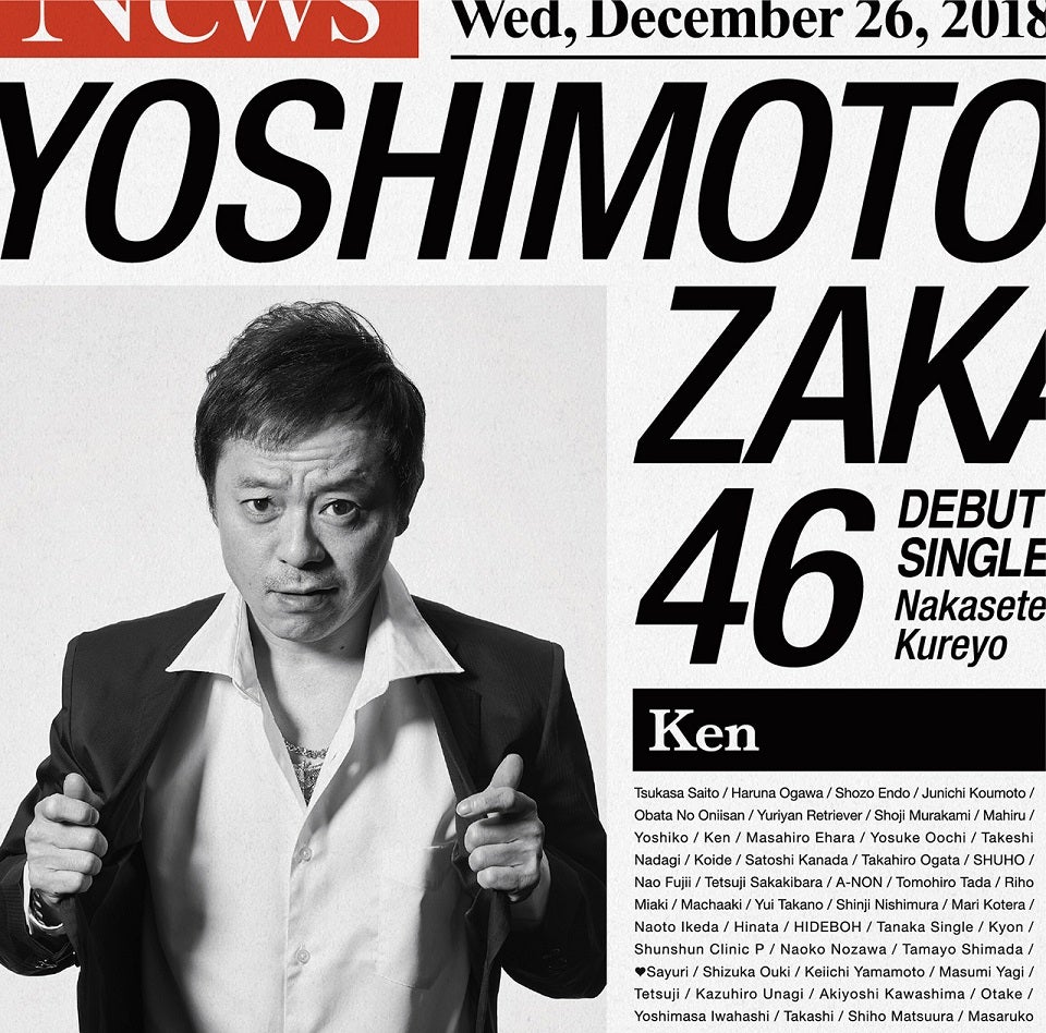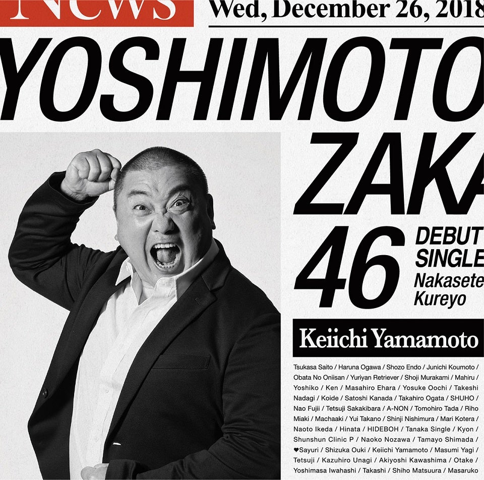 秋元康プロデュースにより、乃木坂46・欅坂46に続く坂道シリーズ第3弾として結成された吉本坂46のデビュー曲「泣かせてくれよ」(12月26日発売)のジャケット写真が完成。46人のメンバーそれぞれの顔写真がジャケットとなり、同一音源では世界最多(発売元調べ)の46品番でリリースされる。(収録曲違い、ミュージックビデオ収録の映像盤と合わせて47品番)