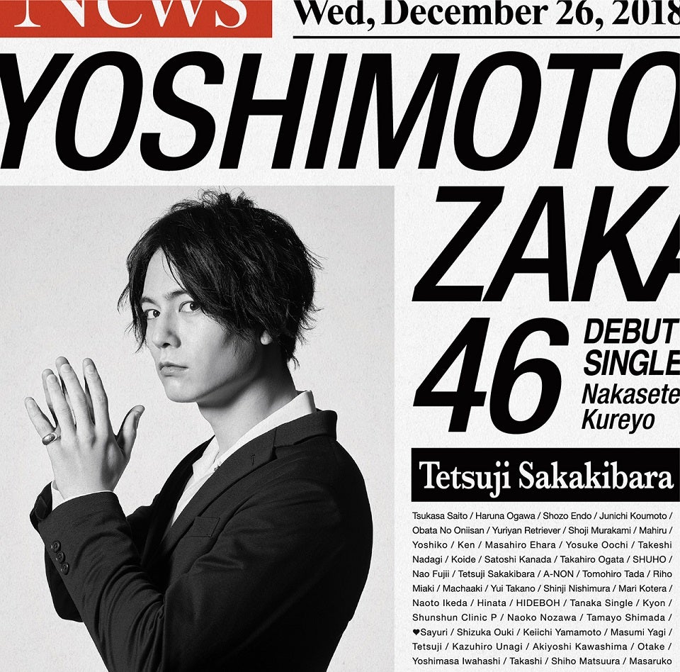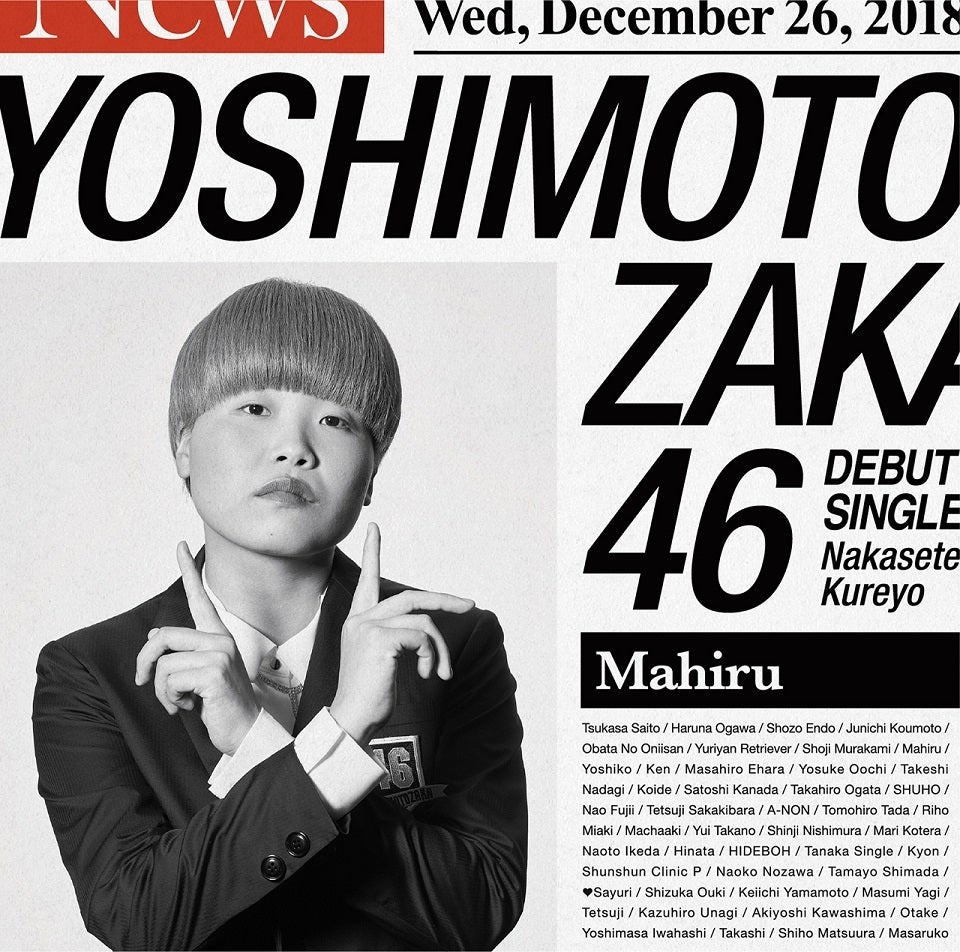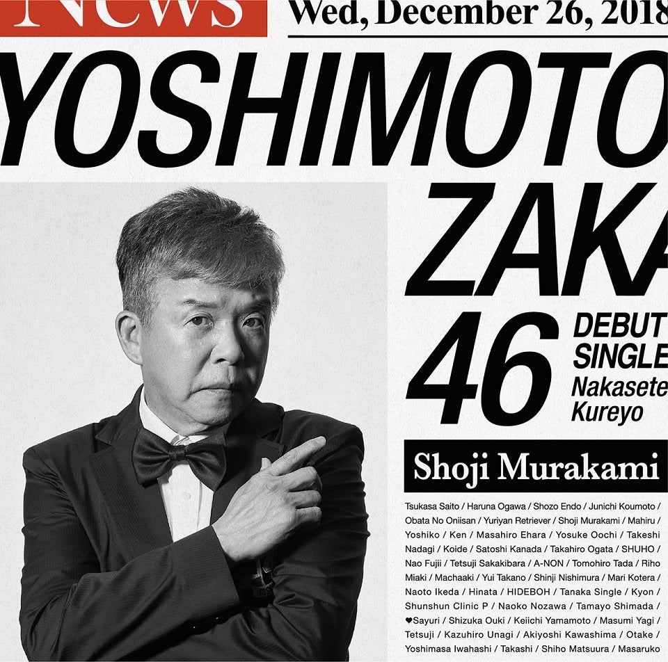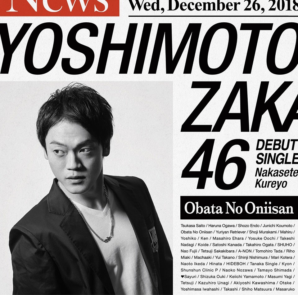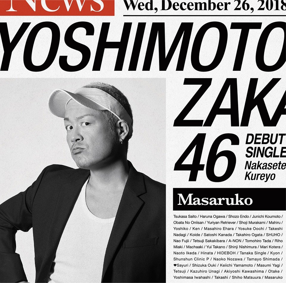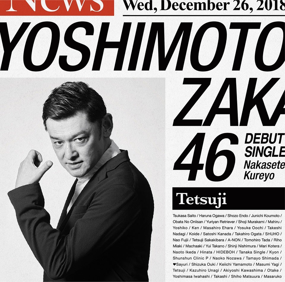 秋元康プロデュースにより、乃木坂46・欅坂46に続く坂道シリーズ第3弾として結成された吉本坂46のデビュー曲「泣かせてくれよ」(12月26日発売)のジャケット写真が完成。46人のメンバーそれぞれの顔写真がジャケットとなり、同一音源では世界最多(発売元調べ)の46品番でリリースされる。(収録曲違い、ミュージックビデオ収録の映像盤と合わせて47品番)