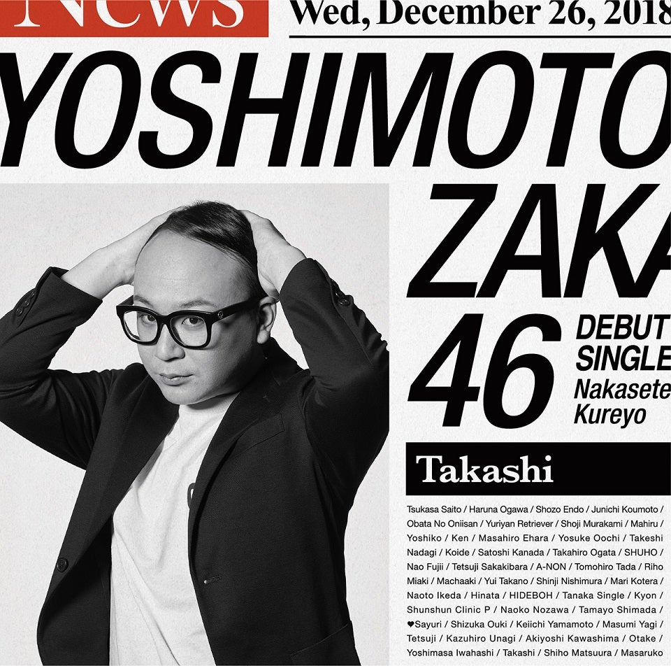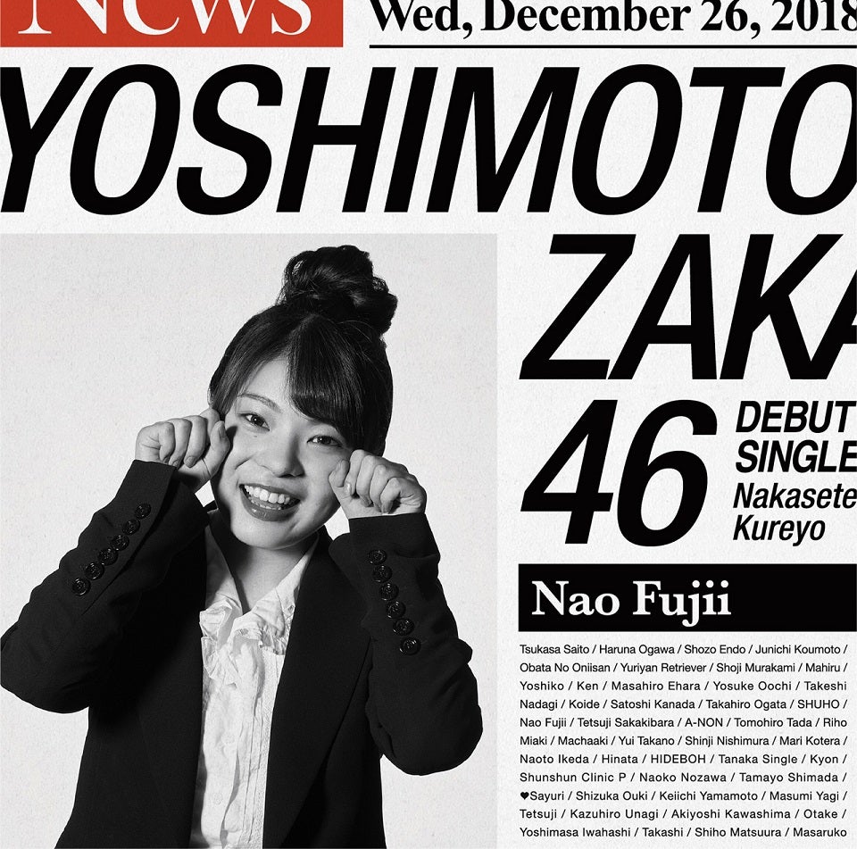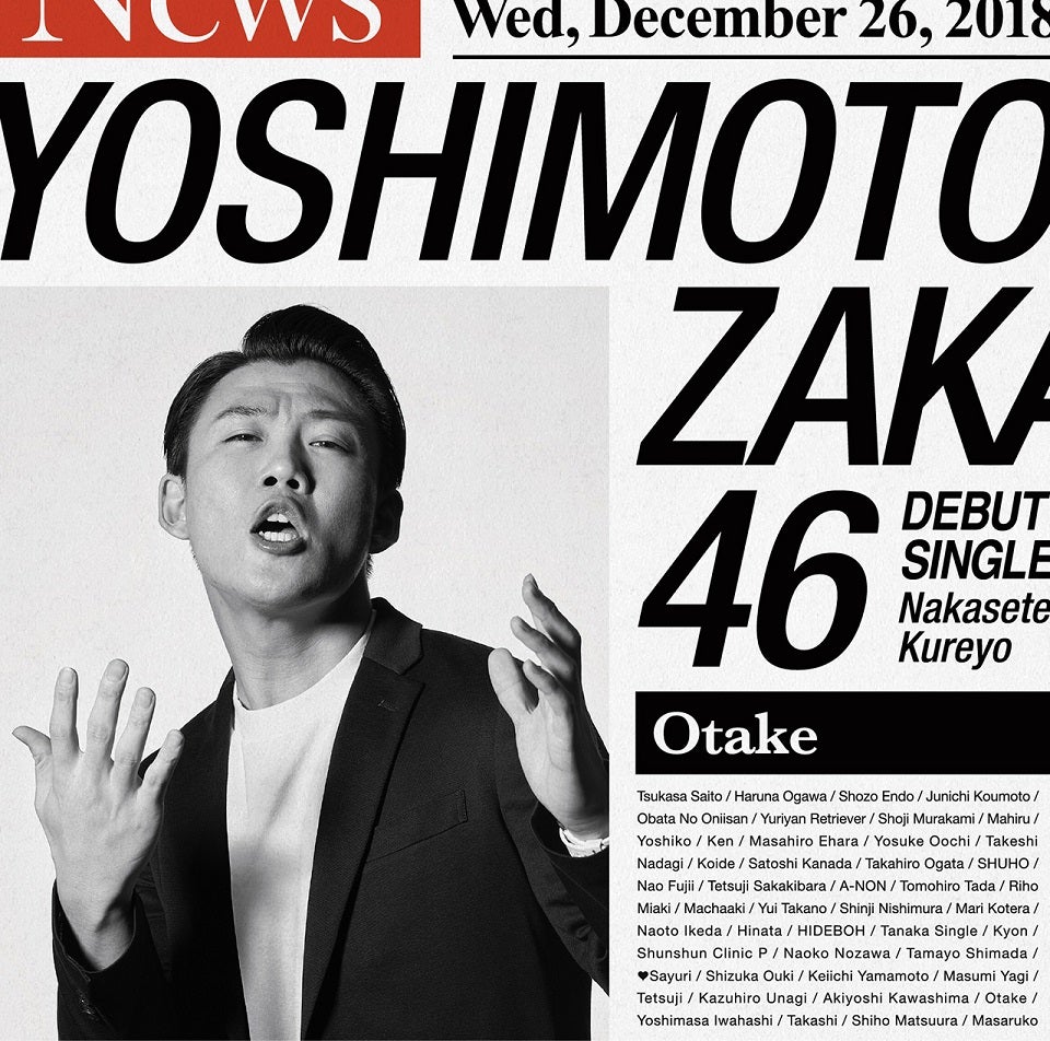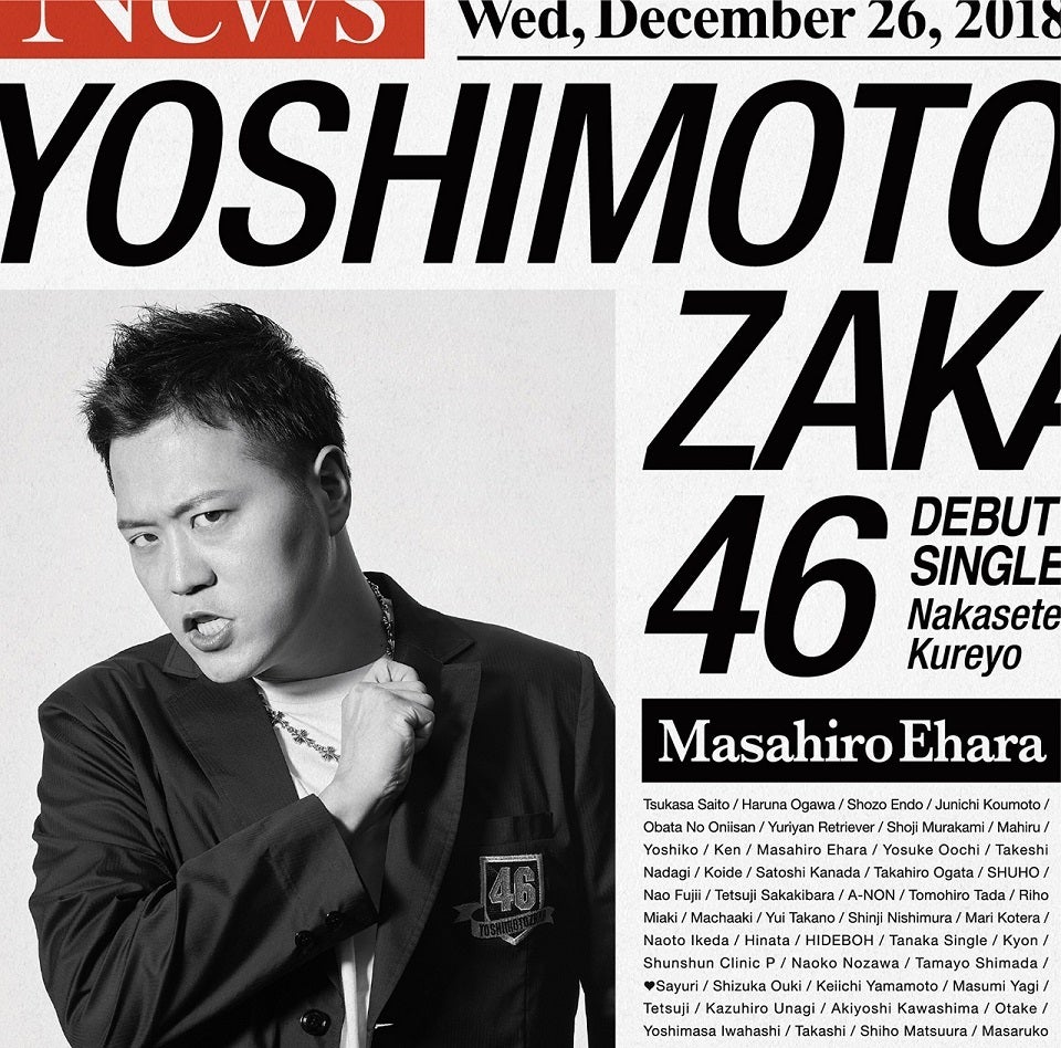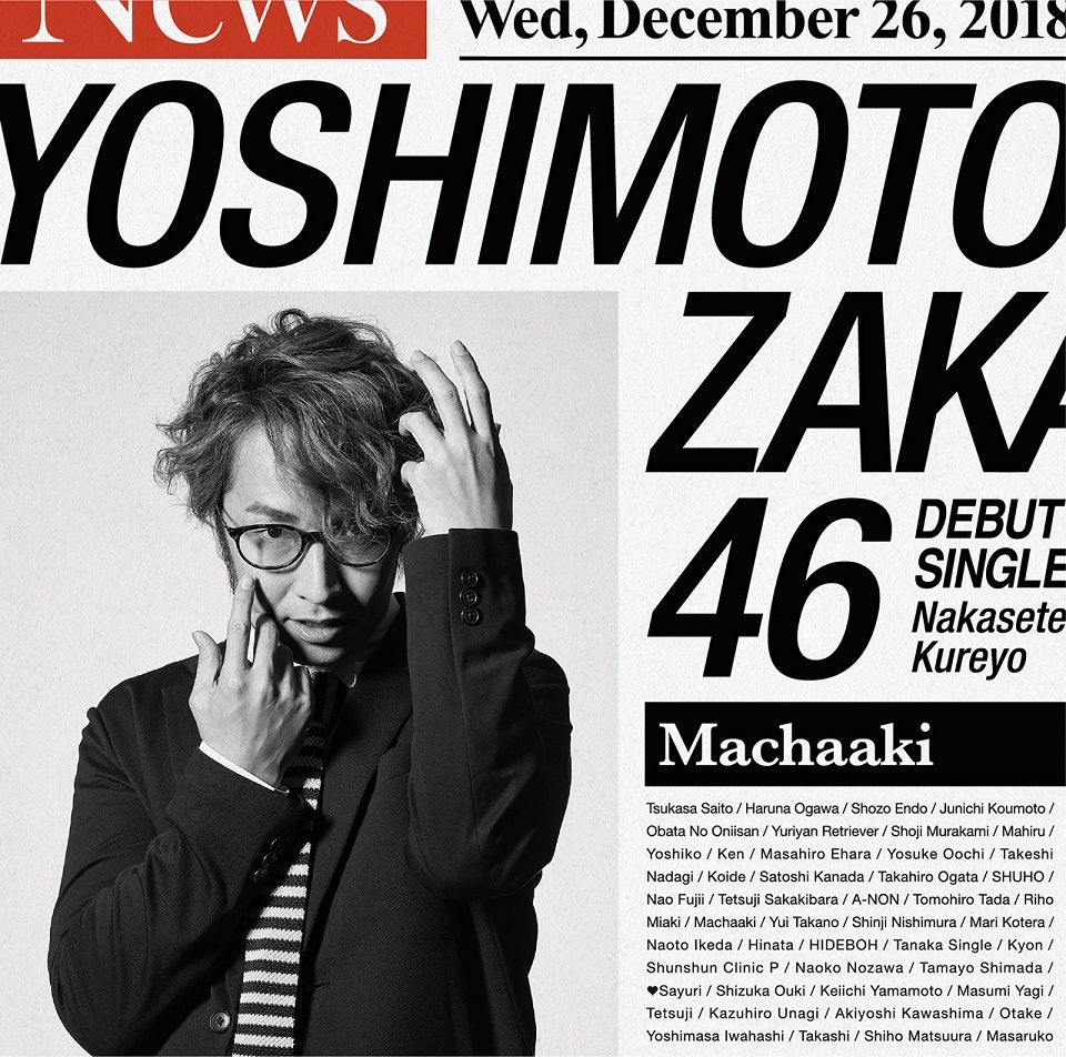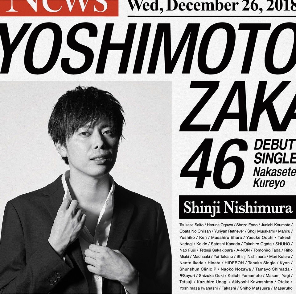 秋元康プロデュースにより、乃木坂46・欅坂46に続く坂道シリーズ第3弾として結成された吉本坂46のデビュー曲「泣かせてくれよ」(12月26日発売)のジャケット写真が完成。46人のメンバーそれぞれの顔写真がジャケットとなり、同一音源では世界最多(発売元調べ)の46品番でリリースされる。(収録曲違い、ミュージックビデオ収録の映像盤と合わせて47品番)