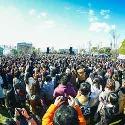 特設ステージが設営された会場には、まずGt.阪井一生が、天王寺の駅からステージまで歩いて登場。会場を盛り上げたのち、阪井の呼び込みで山村を含むメンバー全員がステージにサプライズ登場すると、悲鳴にも似た大歓声が沸き起こった。山村の「天王寺の皆さん、こんにちはflumpoolです!短い時間ですけど楽しんでってださい!」の一言からライブはスタートし、代表曲「花になれ」「two of us」2曲を披露。真冬の野外にも関わらず、短い時間ながら熱いパフォーマンスを待ちわびていたファンに届けた。