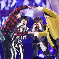 「need you」「Booster」と続け、バッチリ揃ったダンスで観客を一気に引き込むと、「Fashion」では切なげな表情で少し大人な一面を覗かせる。この日の最後を飾ったのは「Kiss Me Baby」。イントロが流れるなり、会場からは期待の悲鳴が。メンバーはセクシーな表情や投げキスで沸かせた。