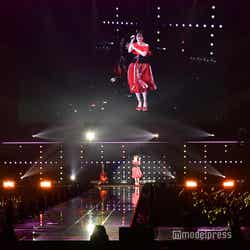デコルテを披露した赤のワンピース姿で登場した大原は、『明日も』で盛り上げる。そのままランウェイ先端まで近づき、ファンに接近。指を指したり、投げキスをしたりと、ファンサービスをたっぷりして沸かせていた。さらに『ちっぽけな愛のうた』の歌唱前には、「皆さんずっと立っていて足が疲れていると思うので座っていただいて、私のときは私を見ずに、目をつぶって歌を聴いていただければと思います」とファンを気遣う神対応も。大きな歓声に包まれながら、伸びやかな歌声を会場いっぱいに響かせた。