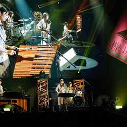 音楽部のステージではまず、関有美子、武元唯衣、松平璃子が『制服と太陽』をピアノ三重奏で届ける。やや緊張した面持ちの彼女たちを見守るように、客席にはオレンジ色のペンライトが優しく灯った。井上梨名がステージに加わると、今度は井上のマリンバ、関のサックス、松平のドラム、武元のピアノによる『バレエと少年』の演奏へ。堂々とした関のサックスソロや息の合ったアンサンブルで場内を沸かせた。