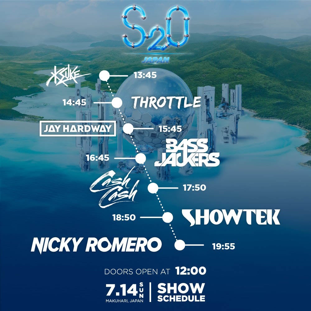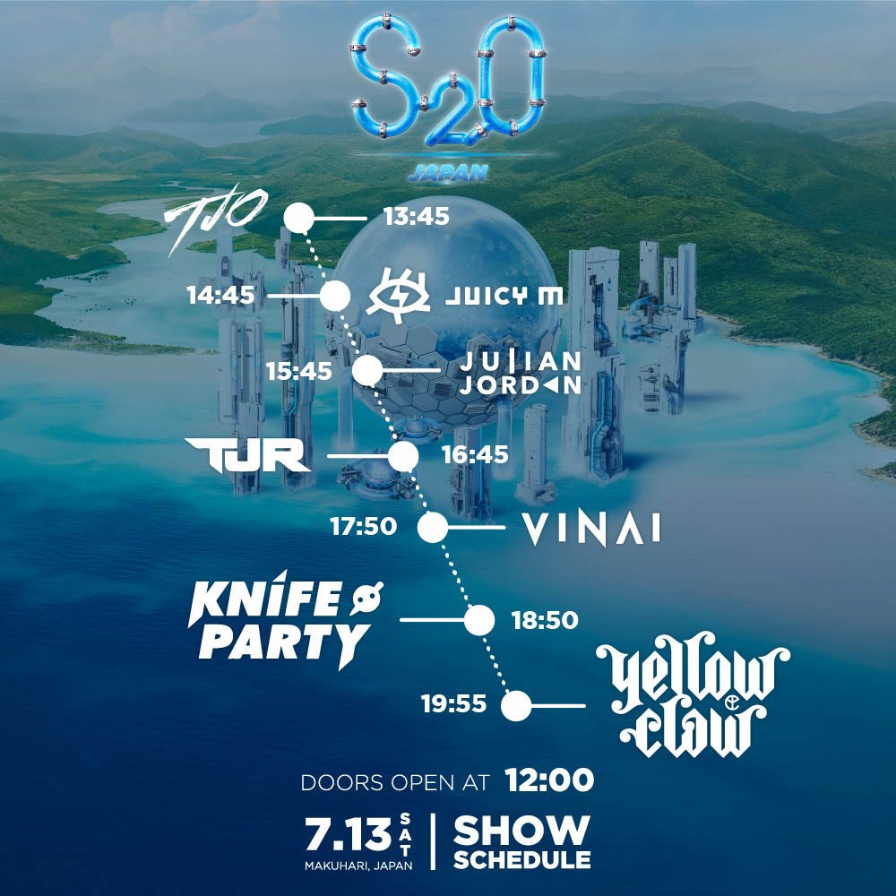 ラインナップ数も増え、盛り上がりを見せる開催2年目のS2O JAPAN 2019。13日には、世界中の音楽フェスに欠かせない、ダブステップのパイオニア「Knife Party」、幅広いジャンルの音楽をミックスした独特なサウンドが魅力の「Yellow Claw」、14日には、現在クラブで一番盛り上がると言われている「Booyah」のトラックメイカー「Showtek」、若くして世界を代表するスーパーDJ/楽曲プロデューサー「Nicky Romero」をそれぞれヘッドライナーに迎える。各日、日本を代表するDJから待望のヘッドライナーDJまで、バラエティ豊かな国内外のトップDJ達が、S2Oならではのフロアに降り注ぐ水飛沫と共に、イベント終了時まで会場を盛り上げていく。