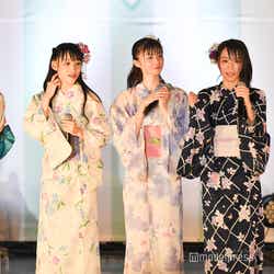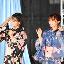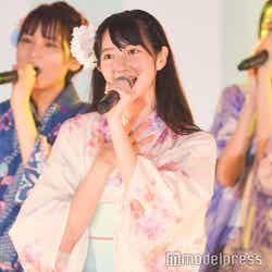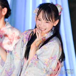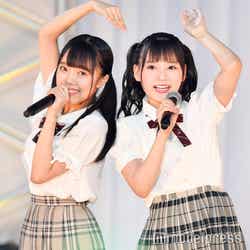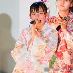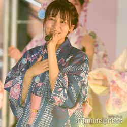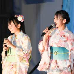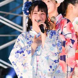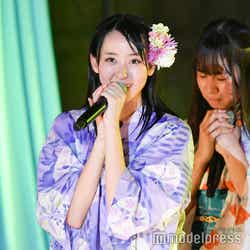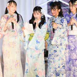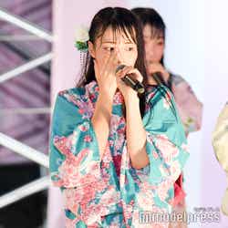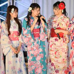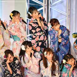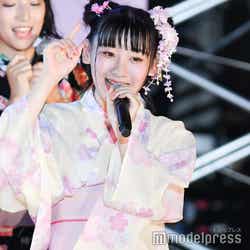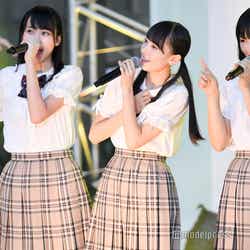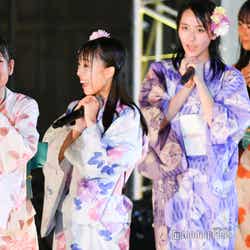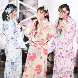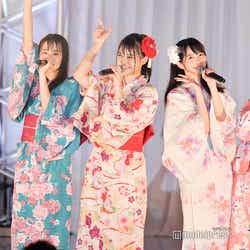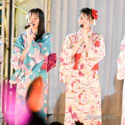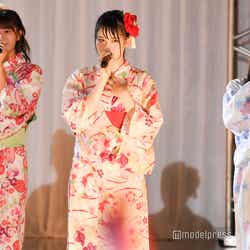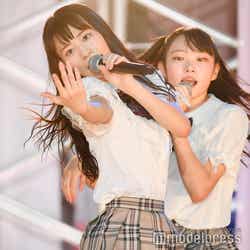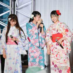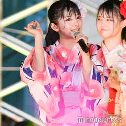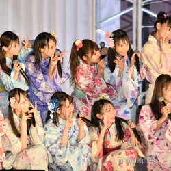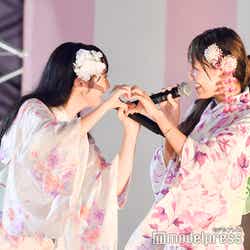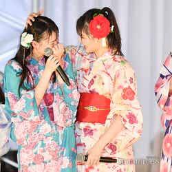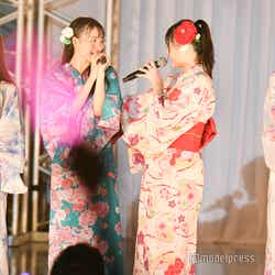 =LOVEのステージは、佐々木舞香と野口衣織のデュオ楽曲「虹の素」でスタート。すっかり日が落ちた野外ステージで抜群の表現力で魅せる2人に観客の視線が吸い寄せられていく。そのまま、諸橋沙夏のソロパートで「記憶のどこかで」が始まり、「手遅れcaution」と“カッコいい”=LOVEで魅了した後は、ツインテールがトレードマークの齊藤なぎさと齋藤樹愛羅のコンビがWセンターに立つ、キュートなイメージを覆すロックテイストの楽曲「いらないツインテール」。2人の煽りが会場中に響いた。最後は4thシングル「Want you! Want you!」で、キュートさ全開にファンを悩殺した。アンコールでは浴衣姿披露
