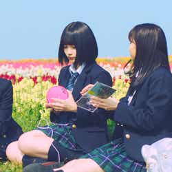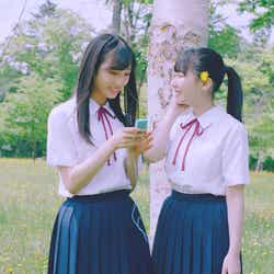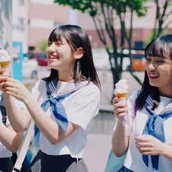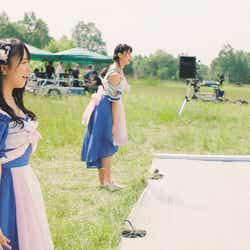 2019年7月、まさに56th「サステナブル」MV撮影中の風景。姉妹グループの末っ子、STU48の瀧野由美子と初選抜である石田千穂がワンショットリップシーンを撮影している。