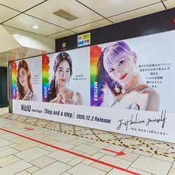 また11月30日よりJR新宿駅や表参道駅では、デビュー曲「Step and a step」に込められたメッセージにフォーカスし、メンバーそれぞれのキラーフレーズを掲出した広告を展開。特に駅構内の天井に空と虹まで登場したJR新宿駅の広告は圧巻だ。