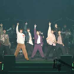 続いてアミューズの若手俳優によるファン感謝イベント「ハンサムライブ」から、“歴代ハンサム”と“現役ハンサム”によるチーム・ハンサム!のコーナーへ。現役ハンサムたちによる「So Free!」でスタートすると、桜田通、渡部秀など歴代ハンサムも加わった「PARTY RIDE」で一気にステージをハンサム色に彩った。続く「Feel The Same」からは佐藤健が登場。チーム・ハンサム!のステージでは久しぶりとなる歌声を披露した。歴代ハンサムメンバーによる「春の花」では、ステージ上のスポットライトをメンバーが囲み、三浦さんのソロパートの歌声も交わり、今も変わらないハンサムたちの絆を感じさせた。ラストの「DEAR MY GIRL」では現役ハンサムと歴代ハンサムが再びステージに集結。ハンサムならではの感謝の気持ちを込めた歌とダンスでハンサムコーナーを締めくくった。エンディングは岸谷のかけ声で本日のステージを盛り上げた出演者たちが再び登場。映画『グレイテスト・ショーマン』の「This Is Me」を圧倒的な歌とパワフルなダンスでパフォーマンス。フィナーレに向けてステージを熱くさせた。