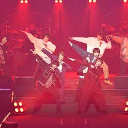 J-POPコーナーの後半戦は城田優からスタート。木村カエラの楽曲「Butterfly」をワルツにアレンジして情感たっぷりに歌い上げた。照明が一気に華やかになり雰囲気は一変して、植原卓也・平間壮一・水田航生による「仮面舞踏会」、猪塚健太・風間由次郎・松島庄汰・栁澤貴彦・吉村卓也による「Z女戦争」と、キレのあるダンスの楽曲が披露されると、続くポルノグラフィティの楽曲「ミュージック・アワー」では、小関・富田健太郎・兵頭功海・福崎那由他・藤原大祐・細田佳央太・松岡広大・溝口琢矢が登場し、サビで定番となっているお馴染みの振付で盛り上げた。