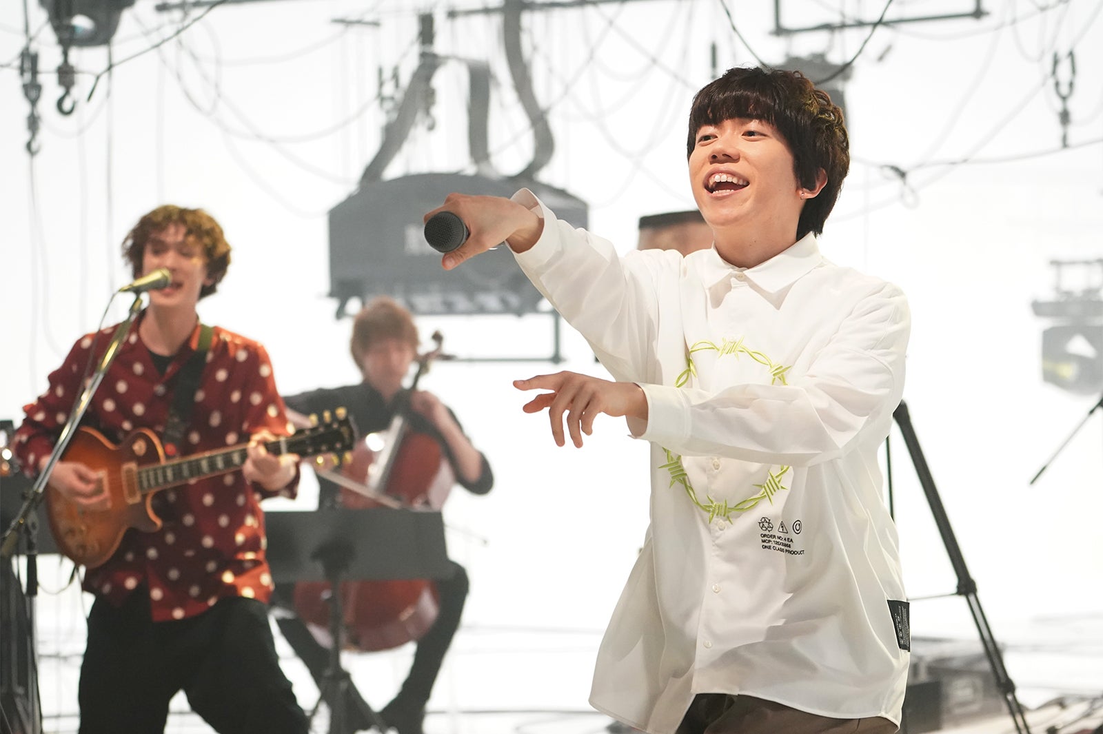 全4~5回ほど行われたリハーサル。毎回、敷かれたラグの上で小躍りしながらに楽しそうに、新曲「Lamp」を披露するsumika。音楽に対して無邪気な姿は、見ている方も元気がもらえる。途中、機材トラブルから音が聞こえなくなるアクシデントに見舞われ、一時撮影が中断する事態となったが、ギターの黒田が、すかさず映画「仁義なき戦い」で流れるあの有名なフレーズを一節かなでたことで、現場がより明るくなった。「Lamp」とは雰囲気がガラリと変わった「Hello, my friend」では最初、自ら演奏するアコースティックギター1本だけで力強く歌い出す片岡の歌声が、鳥肌が立つくらい素晴らしい。スローバラード調に乗せて響く、切なくもノスタルジーに満ちたリリックが、スタジオに優しく響き渡っていた。