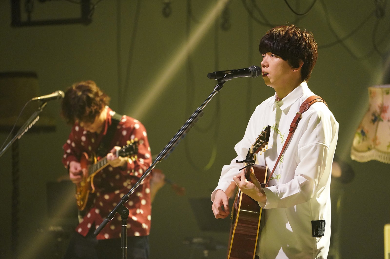 様々な楽器をポップにデコレイトし、“音楽好きが集まる隠れ家”のようなセットにてトークの収録がスタート。sumikaのメンバー全員がひと通り自己紹介を終えると、なぜかみんなでMC2人に向かって「お久しぶりです!」と挨拶。実は2人が出演していたドラマ「おっさんずラブ」の主題歌をsumikaが担当していたことから、2年ぶりの再会に。懐かしみつつ、スタジオは徐々に砕けた雰囲気に。特にsumikaにとってMCの2人は、ドラマの時からファンだったということもあり、ドラマを彷彿とさせる2人のやりとりを目の当たりにし盛り上がっていた。