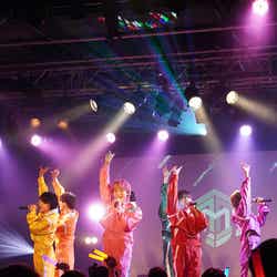 次に披露したのが、和要素を全面に押し出した爆裂祭りナンバーの「やっていくぅ↑」。メンバーらは力強く走る楽曲にあわせ、高ぶる気持ちのままはしゃぎだす。彼らがテンション高く騒ぐのはもちろん、フロア中の人たちも、手にしたペンライトをくるくるまわし、超アゲアゲの和ダンス曲に身を預け、7人と一緒にワイワイ祭り上がっていた。