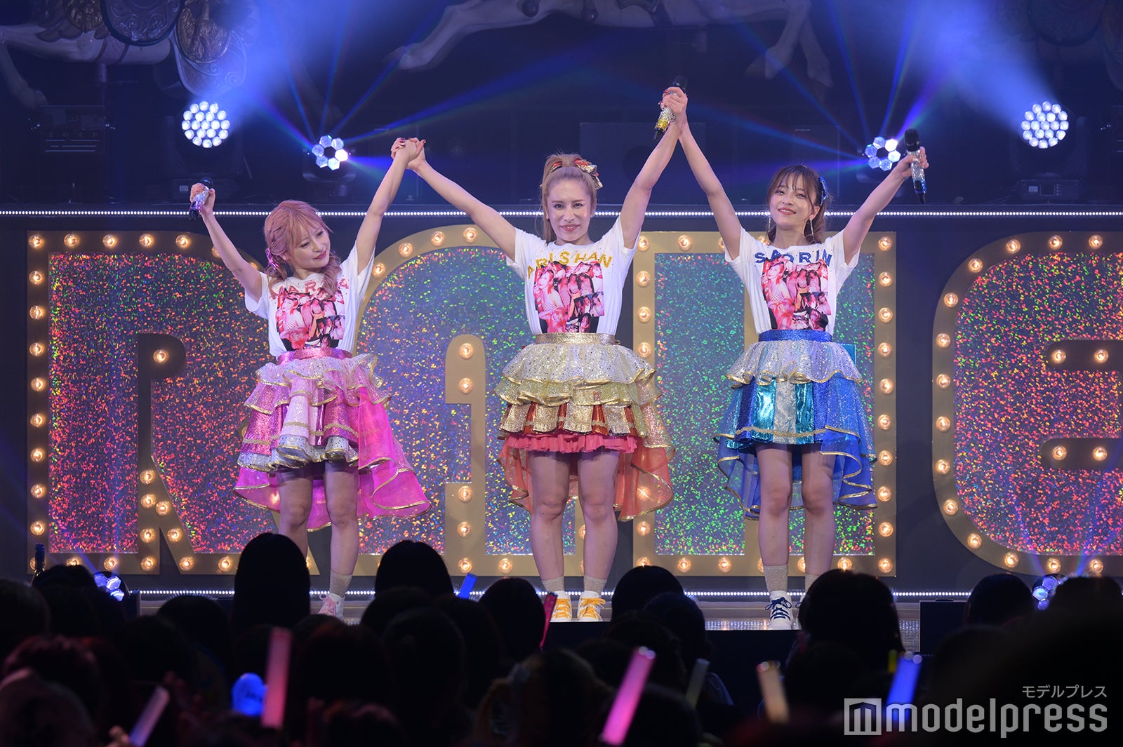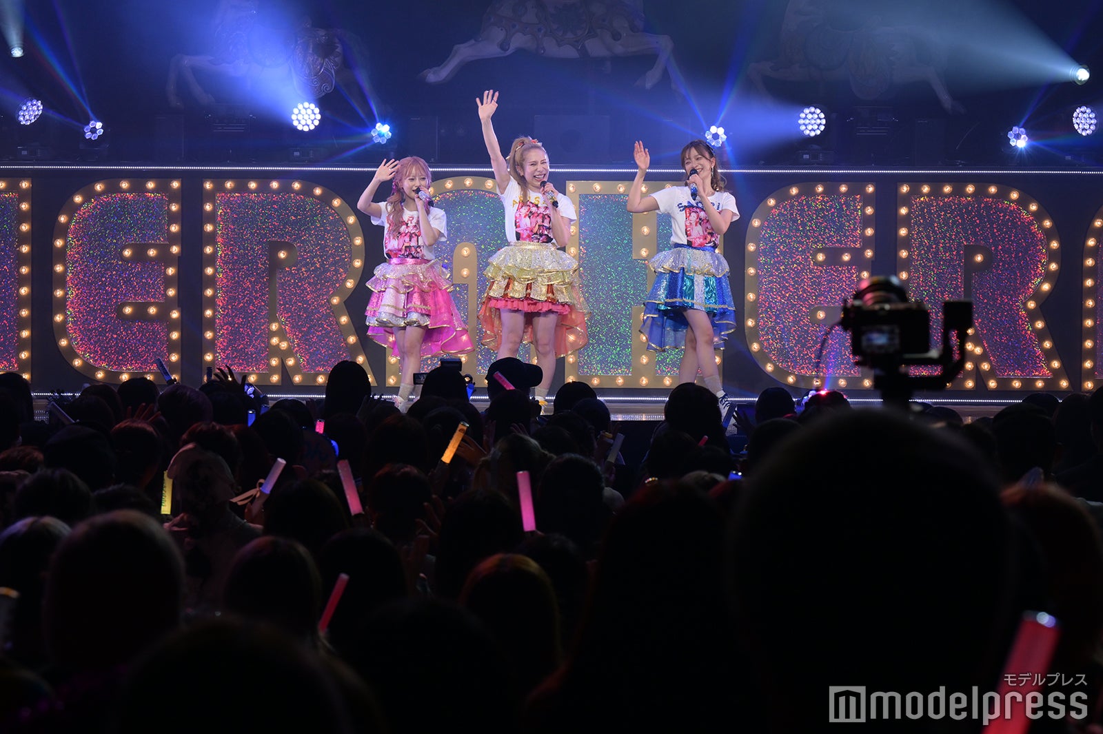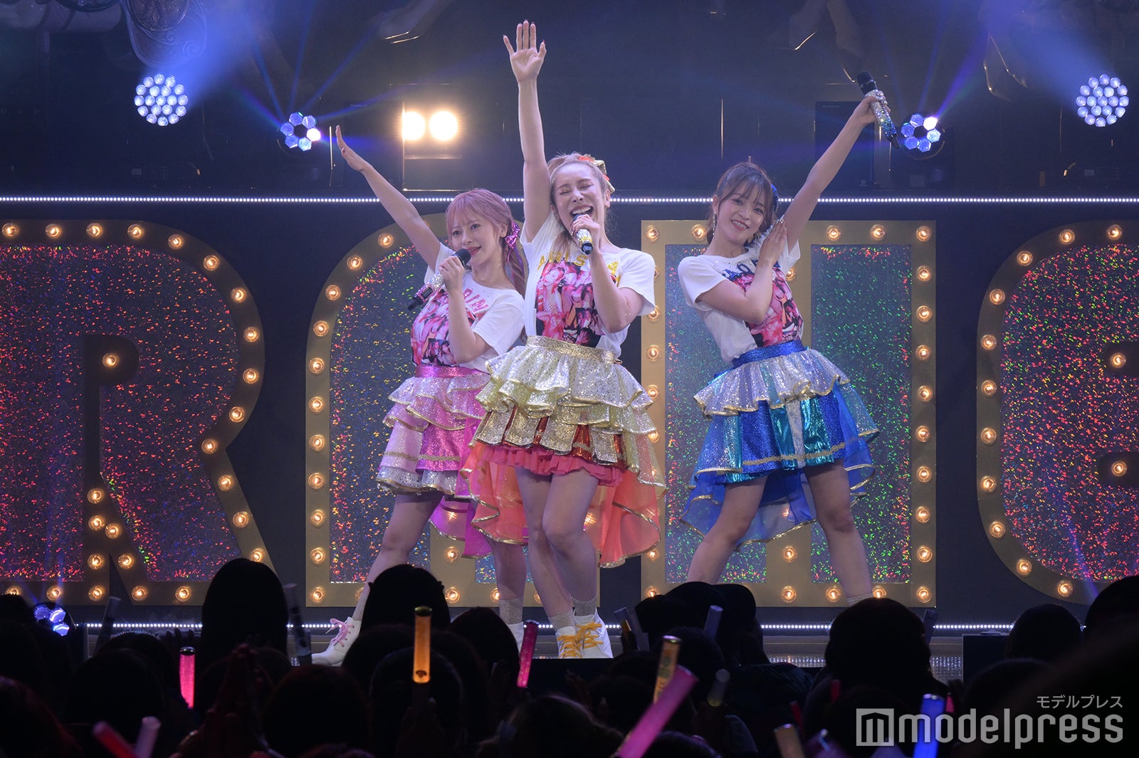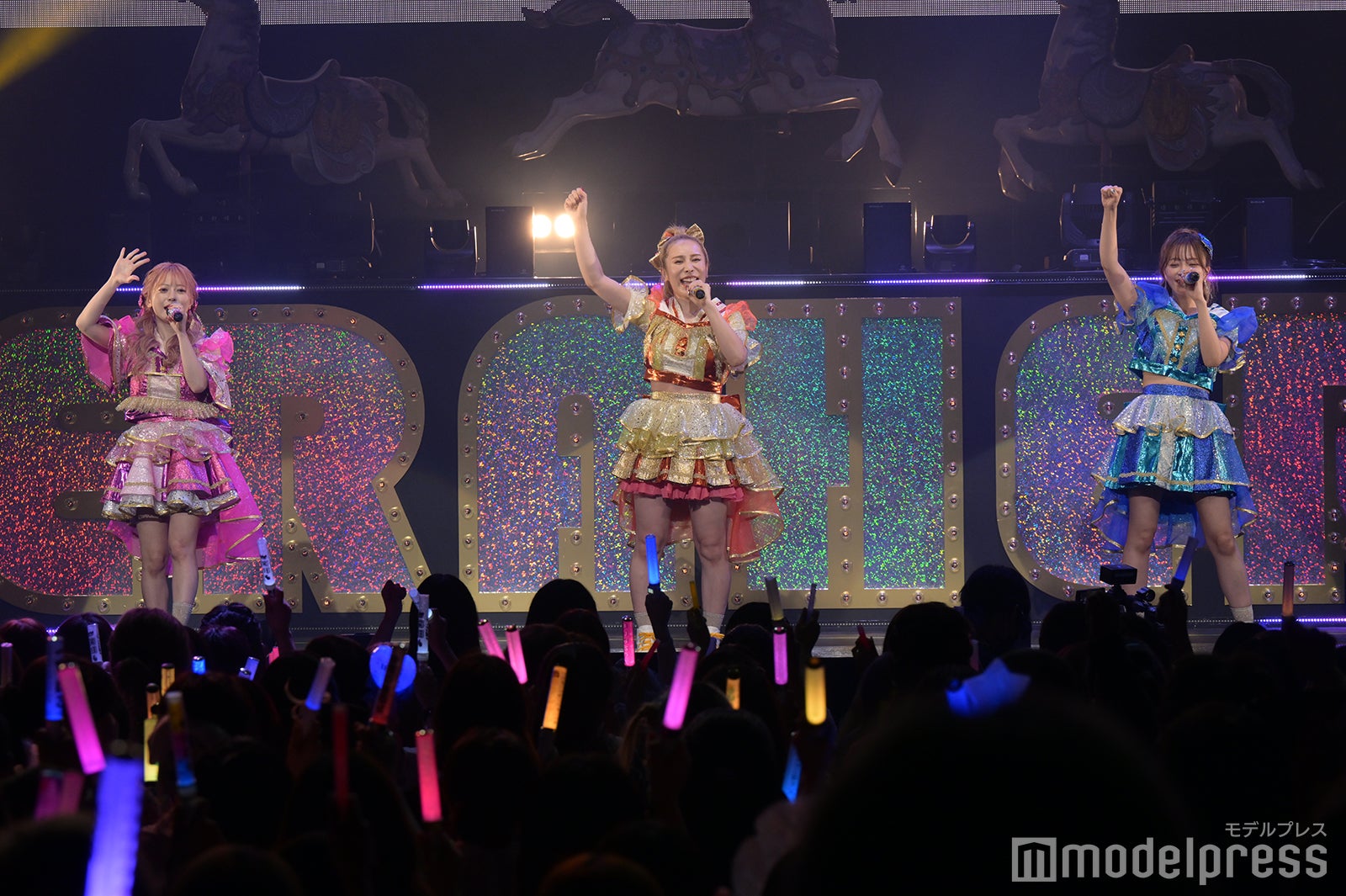 フリルをあしらったメンバーカラーの衣装をまとっていたメンバーだが、アンコールではコンサートTシャツを着用し登場。最後の挨拶では、さおりんがこれまでの活動を振り返り「笑われることもあった」と吐露した一方で「いくつになってもこの3人で頑張っていきたい」と力強く意気込み。ありしゃんはコンサート本番に向けてのダンスや歌への不安もあったとしたが、その経験から学んだこととして「失敗を恐れずにいろんなことに挑戦してほしい」とまっすぐに呼びかけていた。