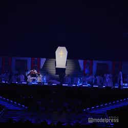 昨年の武道館公演でも独自の世界観で観客を引き込んだ「アイニスタ」(三四郎)は、さらに上を行く演出で楽しませる。「Don't give up~覚醒~」を歌っていたアイニスタさま(相田周二)が突然倒れ別人だと判明し、お付きの人(小宮浩信) が「アイニスタさまを探して下さい!」と観客に懇願。客席からアイニスタさまらしき偽物がゾロゾロと登場しステージに並ぶと、天井から棺が下りてきて本物が登場した。