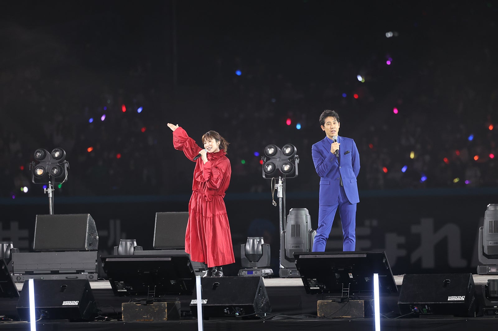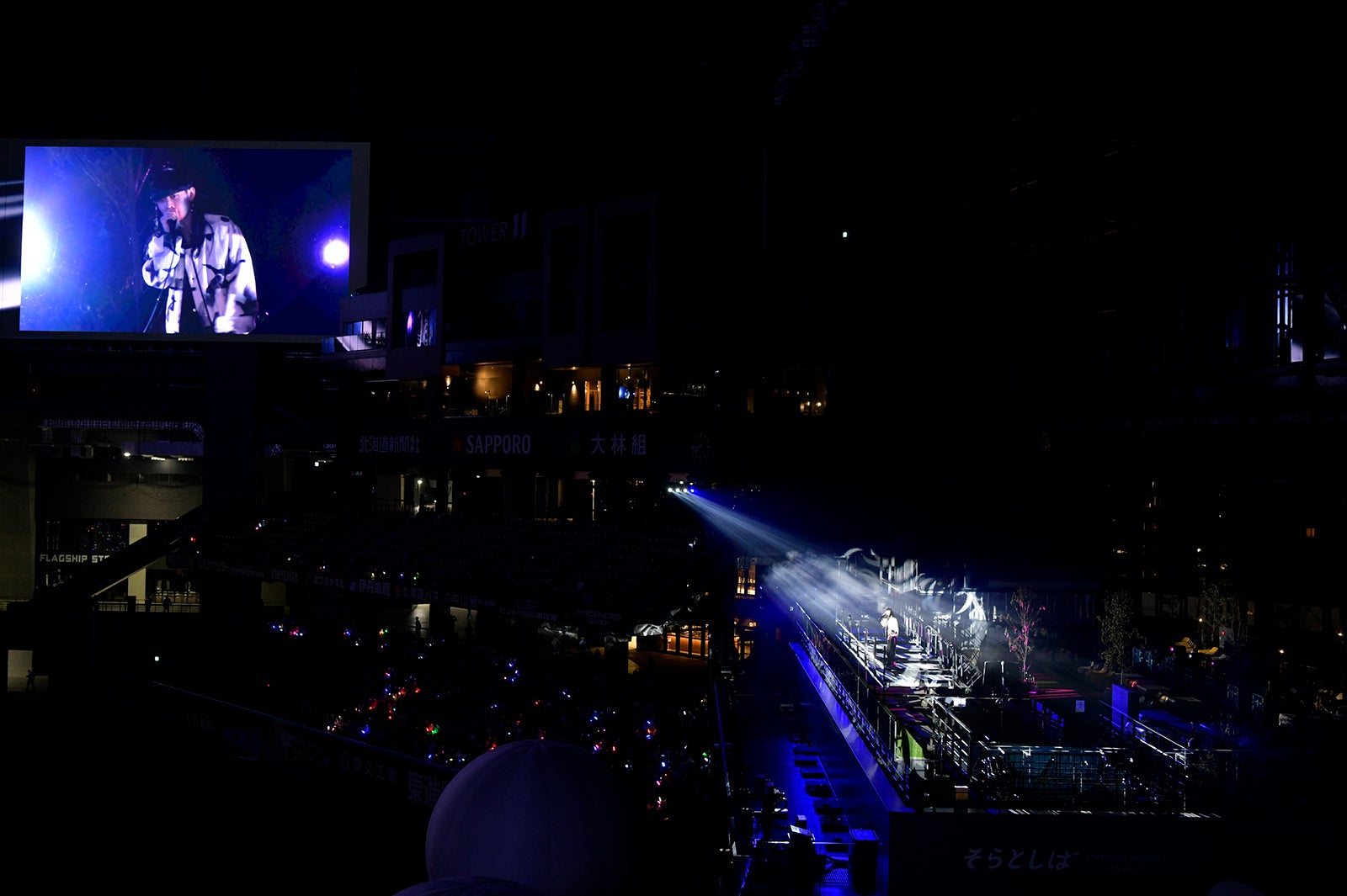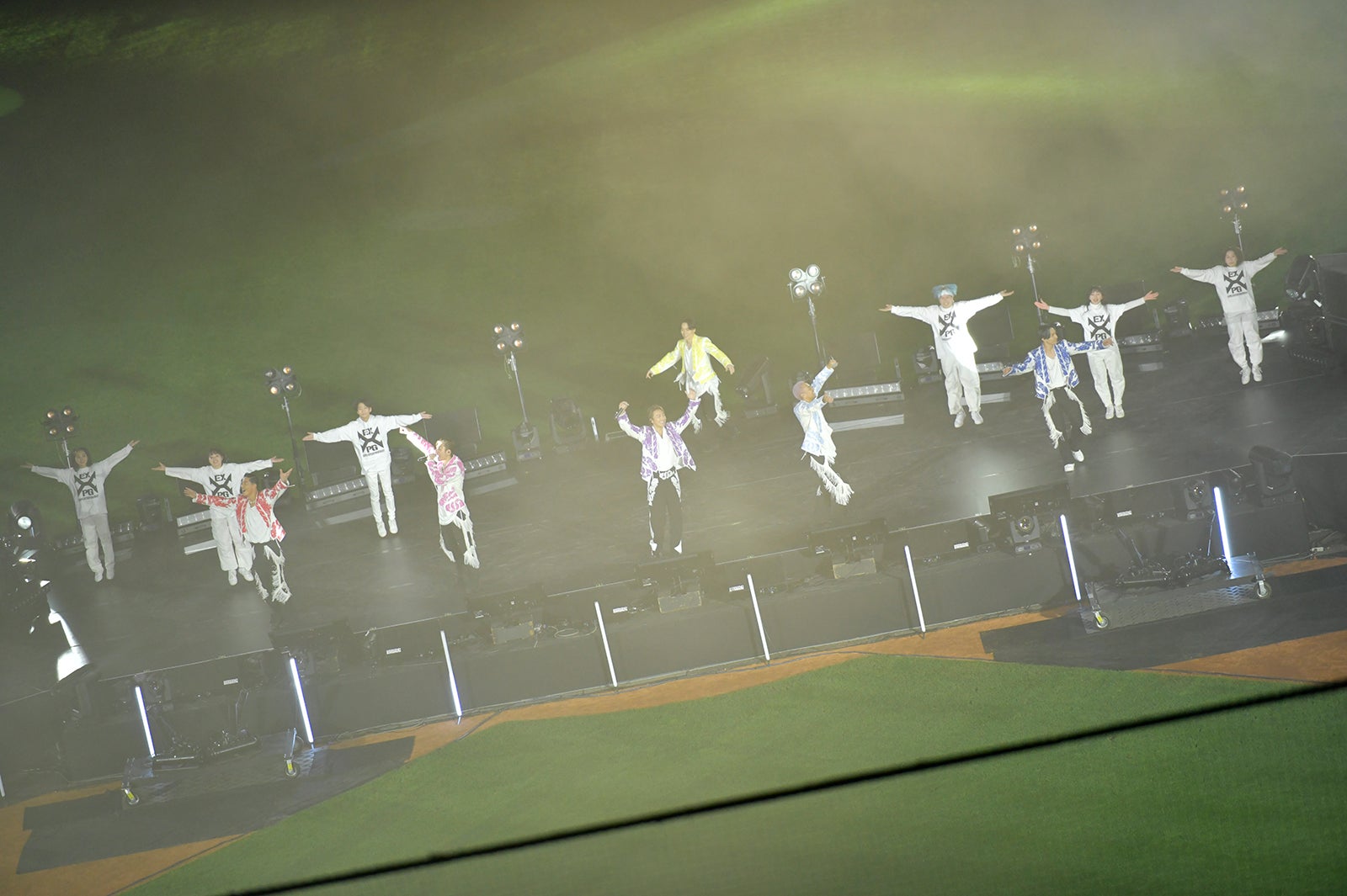 豪華アーティストの競演、音と光が織りなす芸術的な演出によって、会場のES CON FIELD HOKKAIDO(以下「エスコンフィールド」)は野球場にとどまらないライブエンターテイメントの発信地として新たな鼓動を打ち始めた。MCは北海道出身の大泉洋と、映画などで共演歴がある松岡茉優が担当。INI、EXILE(TAKAHIRO/AKIRA/KENCHI/TETSUYA/NESMITH/SHOKICHI)、Travis Japan、Little Glee Monster、SHOW-GOの5組が出演し、それぞれの圧倒的な歌声やパフォーマンスに世界最大級のビジョンを使った迫力ある映像を重ね合わせ、「世界がまだ見ぬボールパーク」に息吹を注いでいった。21,000人が詰めかけたスタンドでは5色のペンライトが振られ、さながら異空間を思わせる彩りと熱気に包まれた。