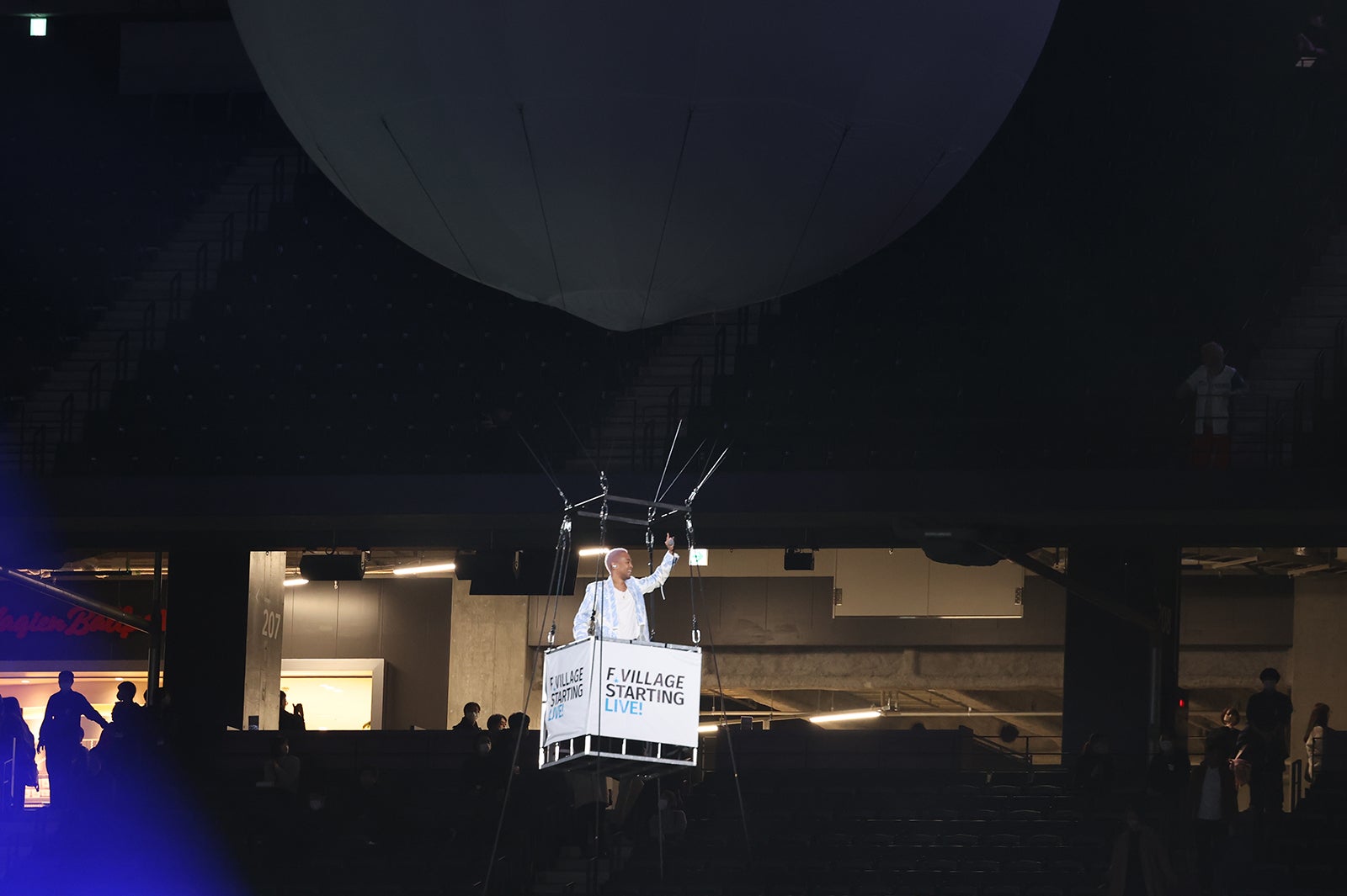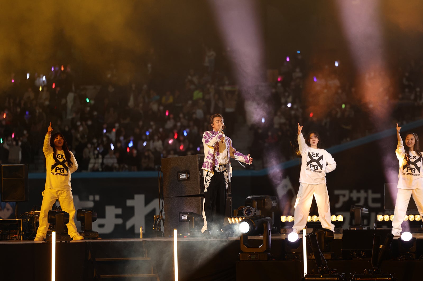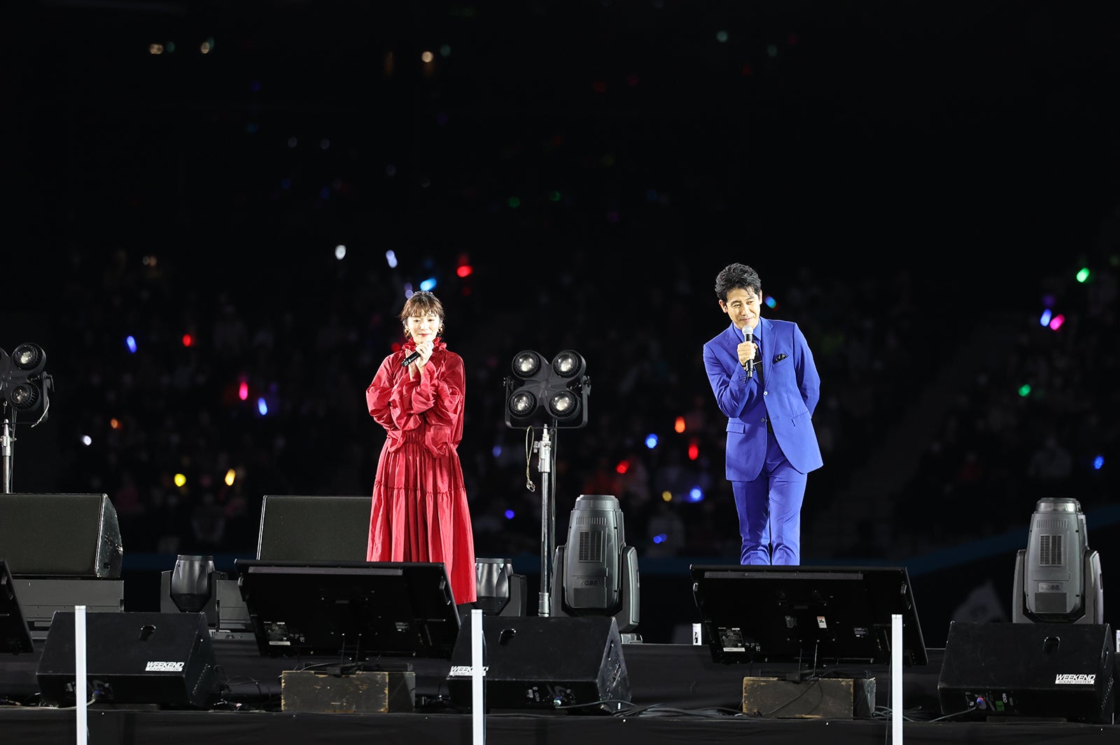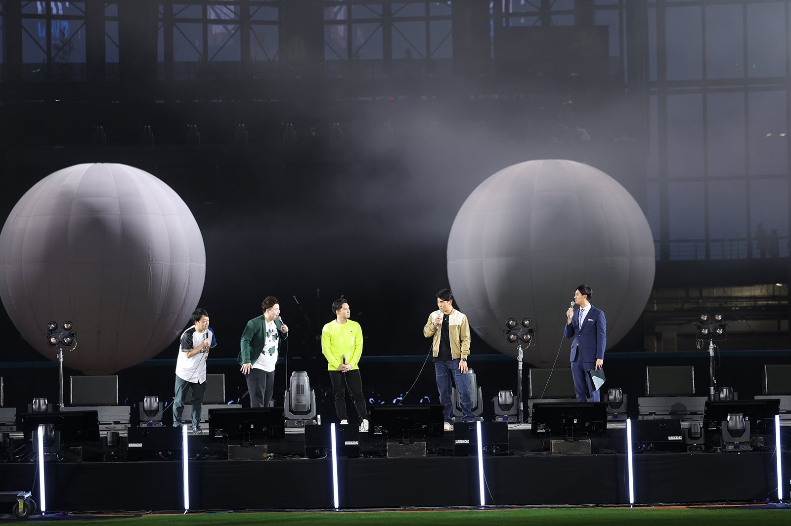 豪華アーティストの競演、音と光が織りなす芸術的な演出によって、会場のES CON FIELD HOKKAIDO(以下「エスコンフィールド」)は野球場にとどまらないライブエンターテイメントの発信地として新たな鼓動を打ち始めた。MCは北海道出身の大泉洋と、映画などで共演歴がある松岡茉優が担当。INI、EXILE(TAKAHIRO/AKIRA/KENCHI/TETSUYA/NESMITH/SHOKICHI)、Travis Japan、Little Glee Monster、SHOW-GOの5組が出演し、それぞれの圧倒的な歌声やパフォーマンスに世界最大級のビジョンを使った迫力ある映像を重ね合わせ、「世界がまだ見ぬボールパーク」に息吹を注いでいった。21,000人が詰めかけたスタンドでは5色のペンライトが振られ、さながら異空間を思わせる彩りと熱気に包まれた。