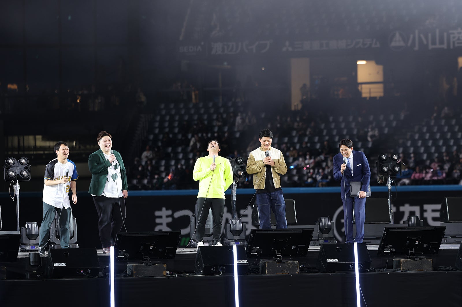 りんたろー。:エスコンフィールドはとんでもなくすごい施設で、そこで最高のメンバーたちと一緒にライブができて、とにかく最高のイベントでした。中継で入ったサウナは、今回は撮影のために温度が低かったけど、あそこでバチっと整って、酒も飲みながら野球が観られたらめちゃくちゃ楽しいだろうなって思いました。兼近大樹:自分も観客としてシンプルに風呂入りながら野球が観たいっすね。あとは、もちろんお笑いライブもやってみたいなって思いました。