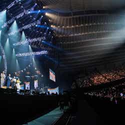 次はINIがパフォーマンス。ステージ前に流されるお宝映像の時点から場内は急激に熱気上昇。最初にひとりでステージに現れたのはメンバーの藤牧京介。2020年に『めざましテレビ』のテーマ曲となったOfficial髭男dismの「HELLO」を1人で初披露するというスペシャルパフォーマンスからスタートした。続いて、大阪城ホールの天井を突き抜けんばかりの歓声が湧き上がり、「CALL 119」からメンバー全員が登場。レーザーライトが飛び交い、キレッキレのダンスパフォーマンスで一気にヒートアップした。「みなさんまだまだ踊れますか~」と煽ってフックの効いた強烈なダンスチューン「BOMBARDA」「BAD BOYZ」を投下。その後、メンバーがひとりずつ挨拶するMCでも悲鳴のような歓声が。