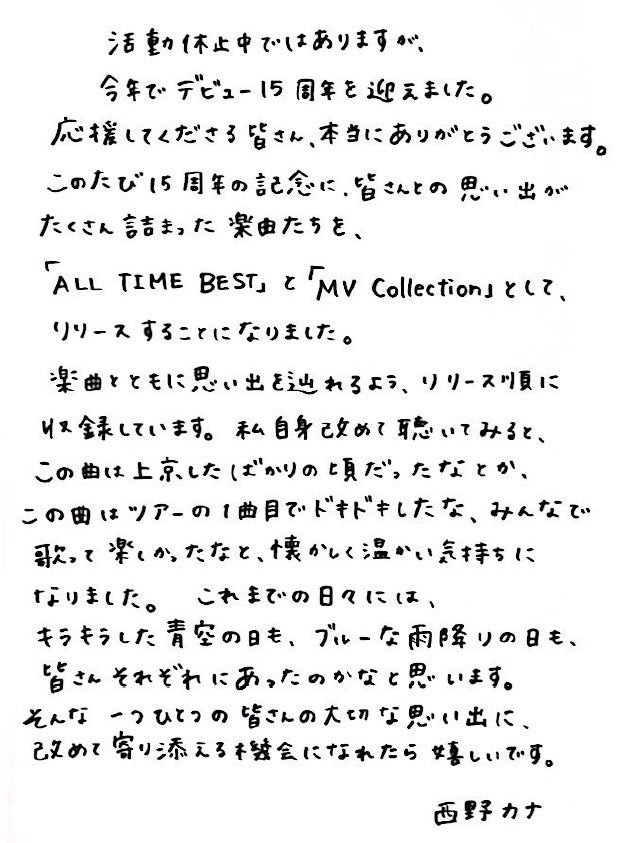 西野は「活動休止中ではありますが、今年でデビュー15周年を迎えました。応援してくださる皆さん、本当にありがとうございます」と長年を共にしたファンに感謝。「皆さんとの思い出がたくさん詰まった楽曲たちを、『ALL TIME BEST』と『MV Collection』としてリリースすることになりました」と明かし「楽曲とともに思い出をたどれるよう、リリース順に収録しています。私自身改めて聴いてみると、この曲は上京したばかりの頃だったなとか、この曲はツアーの一曲目でドキドキしたな、みんなで一緒に歌って楽しかったなと、なつかしく温かい気持ちになりました。これまでの日々には、キラキラした青空の日も、ブルーな雨降りの日も、皆さんそれぞれにあったのかなと思います。そんな一つひとつの皆さんの大切な思い出に、改めて寄り添える機会になれたらうれしいです」と思いをつづった。