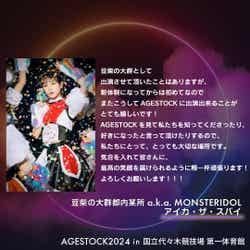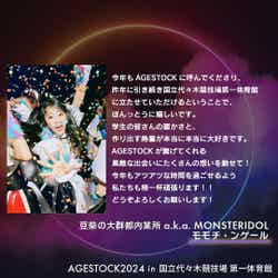 「第3部」のゲストには、BiSHが所属していたWACKから全7組のアーティストが登場。BiSHは「AGESTOCK2017 in TOKYO DOME CITY HALL」を皮切りに、AGESTOCK主催イベントに歴代最多出演してきた。2023年3月5日に開催された「AGESTOCK2023 in 国立代々木競技場 第一体育館」ではBiSH、豆柴の大群、都内某所が出演。解散前最後のAGESTOCK出演となったBiSHのライブアクトでは、会場のボルテージが過去最高潮のものとなった。今年度の「AGESTOCK2024」では、WACKの未来を担う全7アーティストが国立代々木競技場 第一体育館に集結。今回が「AGESTOCK」初出演となるASP/BiS/BiTE A SHOCK/ExWHYZ/GANG PARADE/KiSS KiSSを始め、「水曜日のダウンタウン」から生まれたアイドルグループ・豆柴の大群と都内某所が合併した新グループ「豆柴の大群都内某所 a.k.a. MONSTERIDOL」ら7組が、初めてステージに立つ“一夜限りの、100分間のひな祭り”となっている。(modelpress編集部)