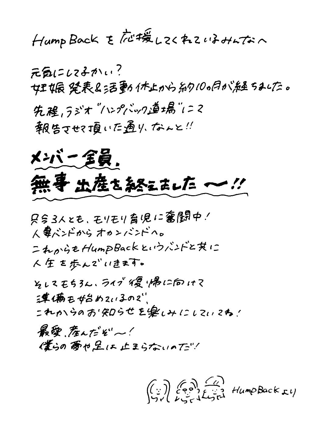 最後は「最愛、産んだぞ~!」「僕らの夢や足は止まらないのだ!」と喜びと決意表明を口にし、可愛らしい3人のメンバーのイラストを添えて思いを伝えたHump Back。同メッセージとともにアップされた写真には「母になりました」という手書きの文字と、それぞれが子どもを抱いた3人の姿が写るものとなっている。