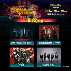 毎年多数のアーティストが出演する『テレビ朝日ドリームフェスティバル』。今回はテレビ朝日開局65周年を記念して史上最大規模となる5日間での開催となる。第2弾として、9月に出演するアーティストの中から9組を発表。15日には、今年結成20周年を迎え、7月にベストアルバムの配信が決定したロックバンド・9mmParabellum Bullet、高い音楽性を兼ね備え、モダンなラウドロックから歌謡曲、ポップで爽快なサウンドまで変幻自在、キャッチーでユーモアあふれる世界観で魅了する大注目のロックバンド・-真天地開闢集団-ジグザグ、B‘zの松本孝弘が長年の構想を元に2004年に結成したプロジェクトで今年再始動を発表したTMG、今年で結成35周年を迎えバンド史上最大規模となる全国ツアーを展開する中、ファイナルとして14年ぶりの東京ドーム公演開催を発表したロックバンド・LUNA SEAが出演する。