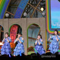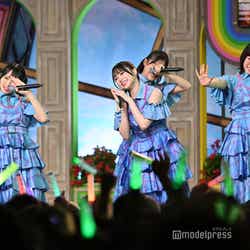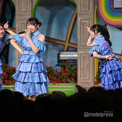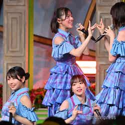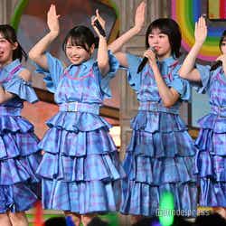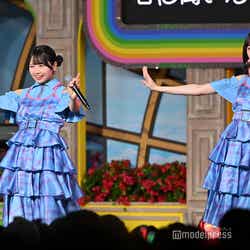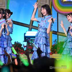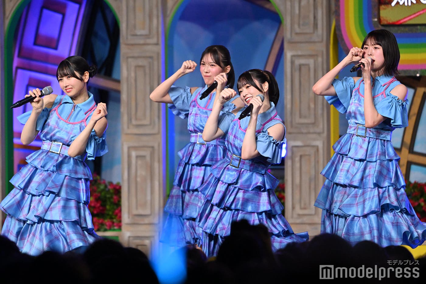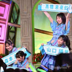 日向坂46からは、三期生・上村ひなの、高橋未来虹(※「高」正しくは「はしごだか」)、森本茉莉、山口陽世の4人が出演。夏らしいブルーの肩出し衣装で登場すると、三期生楽曲『Right?』でフレッシュに幕開け。山口陽世が「一緒に声出してくれますか〜?」と煽ると会場のおひさま(※日向坂46ファンの愛称)からは大きな歓声が起こった。続いて披露した『パクチー ピーマン グリーンピース』では、曲名の食べ物にちなんで会場がグリーンのサイリウムに。『ゴーフルと君』ではキャッチーな振り付けとおひさまからのコールで会場に大きな一体感が生まれた。