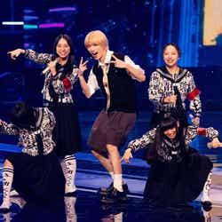 2人がそれぞれ分かれてはけると中央のスクリーンの奥から出てきたのはTAEHYUN(テヒョン/TOMORROW X TOGETHER)とHEESEUNG(ヒスン/ENHYPEN)。低音から高音まで自由自在に歌う2人によるOfficial髭男dismの「Pretender」には、思わず聞き惚れてしまう。TAEHYUNが「甘いな いやいや」という歌詞で元のメロディよりも高いフェイクを入れたり、「君は綺麗だ」で2人が見つめ合ったりと、ファンを何度も釘付けにしていた。