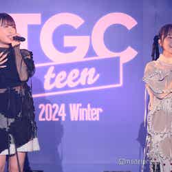 透け感のある白と黒のシミラールック衣装で登場したむくとえなぴ。1曲目「でこぼこシンフォニー」では、観客に笑顔を向けながら歌唱。背中合わせでダンスを踊ったり、時に顔を見合わせ微笑み合ったりと、息ぴったりのパフォーマンスを披露した。2曲目「エキストラ」では、バラード調の楽曲に2人の歌声がマッチ。美しいハーモニーを響かせていた。MCコーナーでは「盛り上がっていますかー!?」とえなぴが会場に向かって声をかけると大きな歓声が。2024年最後の「TGC teen」の出演に感謝を述べつつ観客に拍手を求める場面もあり、持ち前の明るさで会場を盛り上げていた。