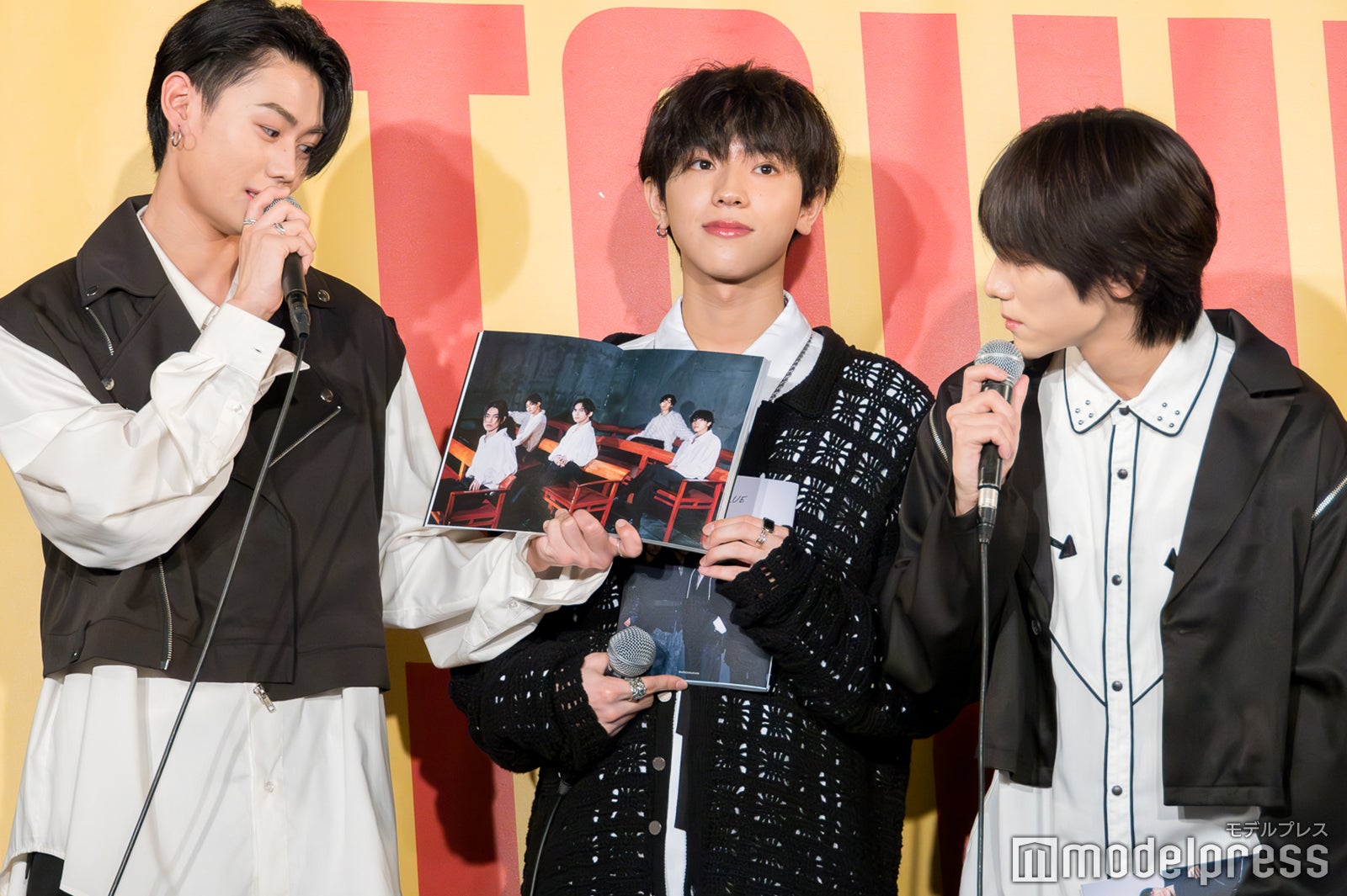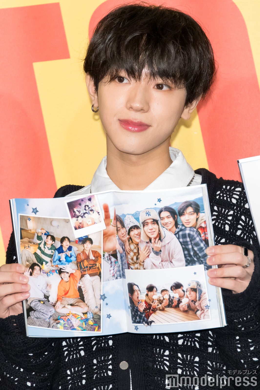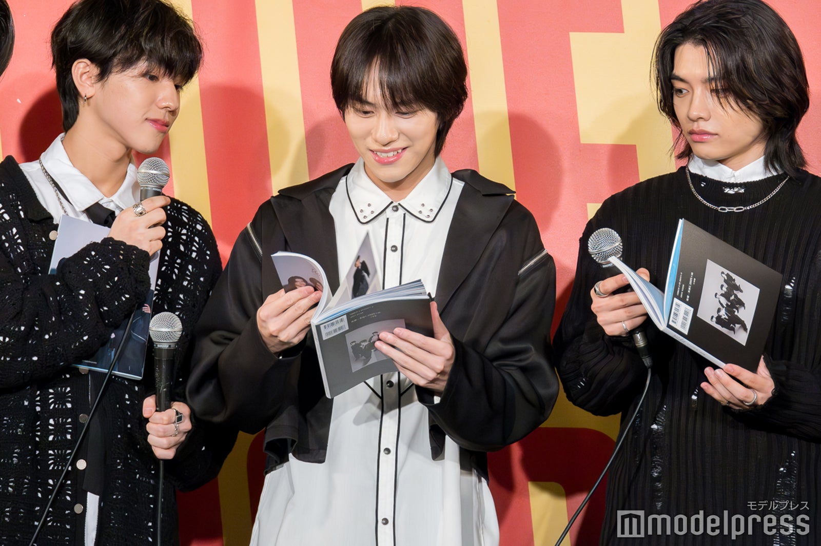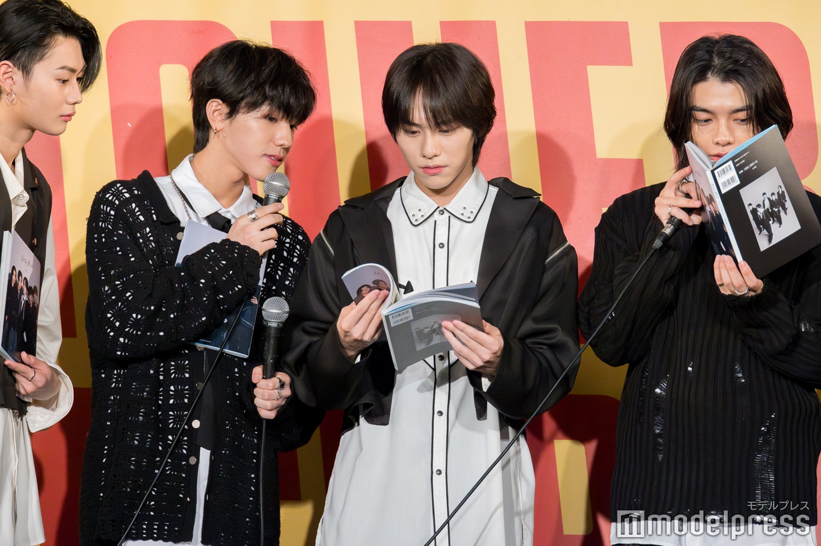お気に入りのカットを紹介する場面では、鈴川が気球に乗った際のカットを披露。「気球が浮いている方のページは顔が僕たちほぼ見えないんですけど、めっちゃ颯くんと優斗が怖がっていて、そこをちゃんと見てほしい」と呼びかけ、本作のテーマを聞かれた山下は「WILD BLUEってどんなグループだ、という名刺代わりになるような本かなと思っています」と回答。「だからファンの皆さんをSTARRY(スターリー)と言うんですけど、STARRYの皆さんにはこれを持ってライブとかに行って、『僕、STARRYです』『私、STARRYです』という感じで見せてもらったら嬉しい。『私こういうものです』みたいな」と、STARRYにも名刺の代わりに本作を持ち歩いてほしいと伝えて笑いを誘った。次に、池田が「表紙も4つパターンがありまして」と話し、「色んなカバーがあるので、全種類買っていただいたらすごく嬉しい」とアピール。すると宮武は「4つ集めると願いが叶うので」と笑わせた。