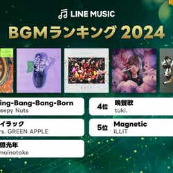 LINE MUSICにおいて、2024年に最も再生された楽曲・アーティストをランキング形式で発表する「LINE MUSIC年間ランキング2024」。今年はCreepy Nuts「Bling-Bang-Bang-Born」が、楽曲ランキング、10代トレンドランキング、BGMランキング、着うたランキングの4冠を受賞し、「アーティストランキング」では、2023年に続き、2年連続でMrs. GREEN APPLEが受賞した。また、LINE MUSICが独自のロジックで算出した年間ランキングをもとに2024年にランキングが上昇した・話題を集めた注目の楽曲10曲を選出する「トレンドアワード」を発表したほか、LINE MUSICユーザー向け企画「#LINEMUSICで振り返る2024」では、自分が聴いた音楽とともに2024年を振り返ることができる。2024年、LINE MUSICで最も再生された楽曲には、Creepy Nuts「Bling-Bang-Bang-Born」が選出。今年の1月に放送されヒットしたテレビアニメ「マッシュル-MASHLE- 神覚者候補選抜試験編」オープニングテーマとしてリリースされて以来、LINE MUSICの月間ランキングでは2月から5月まで4か月連続1位を獲得するなど、多くのユーザーに支持され、再生を伸ばした。また、「Bling-Bang-Bang-Born」は、10代トレンドランキング、BGMランキング、着うたランキングでも1位を獲得し、4冠を受賞する結果となった。これを受けて、Creepy Nutsは「とても多くの⽅にLINE MUSICで聴いていただいているということでありがとうございます!これからもCreepy Nutsを聴いていただけると嬉しいです!」とコメントした。