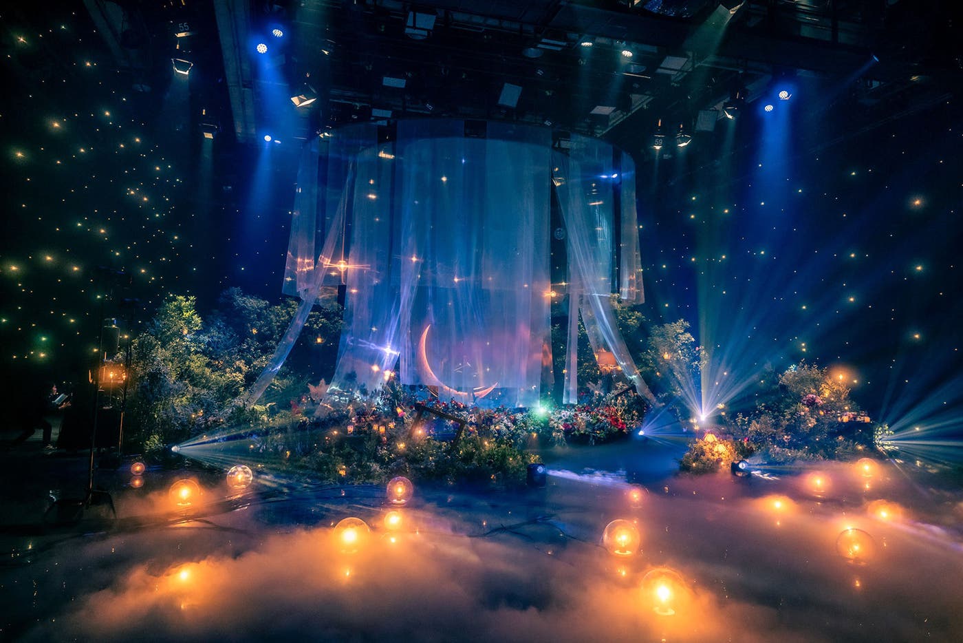 素顔を非公開で活動しているtuki.は、ヒット曲「晩餐歌」をテレビ初披露。司会の橋本環奈は同楽曲について「難しくてカラオケで歌えない…でも今日はどんなパフォーマンスになるか楽しみです!」と話した。水に囲まれたステージで月の上に乗り、ギターを弾きながら歌唱したtuki.。透け感のあるベールを垂下げ、顔は見えない状態でのパフォーマンスとなった。後ろ姿からは紺の制服を着用している姿も。歌唱後に来年の抱負を問われると「来年はもっと良い活動ができるように頑張ります!」とコメントした。