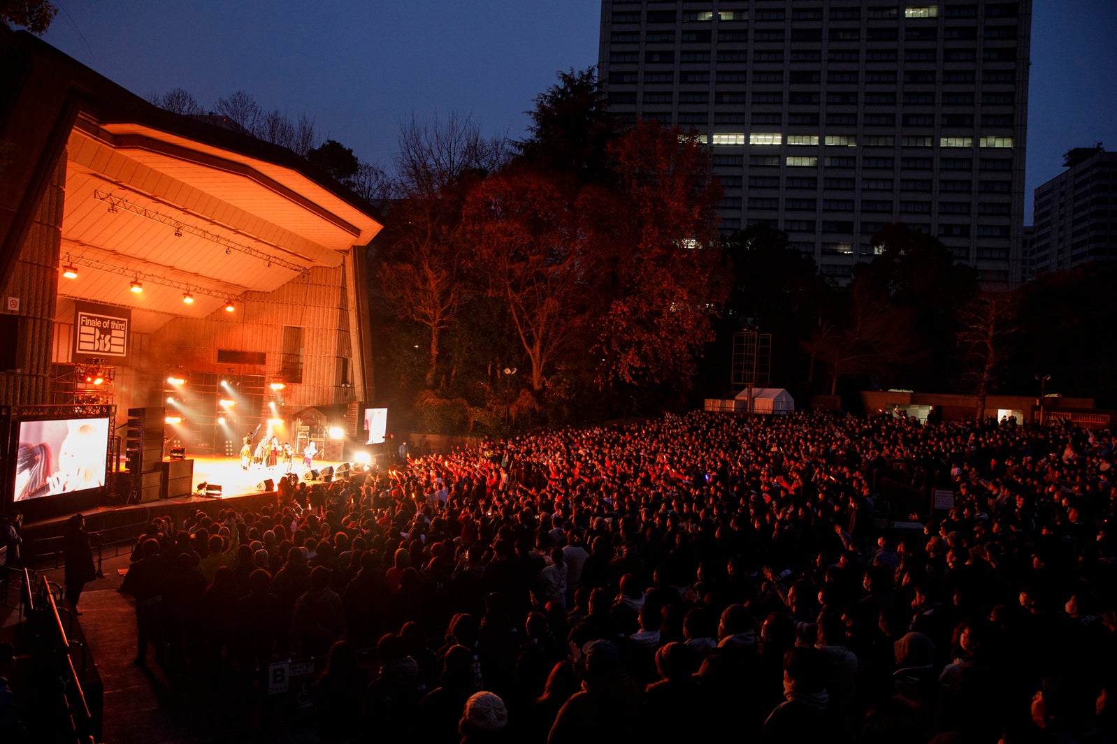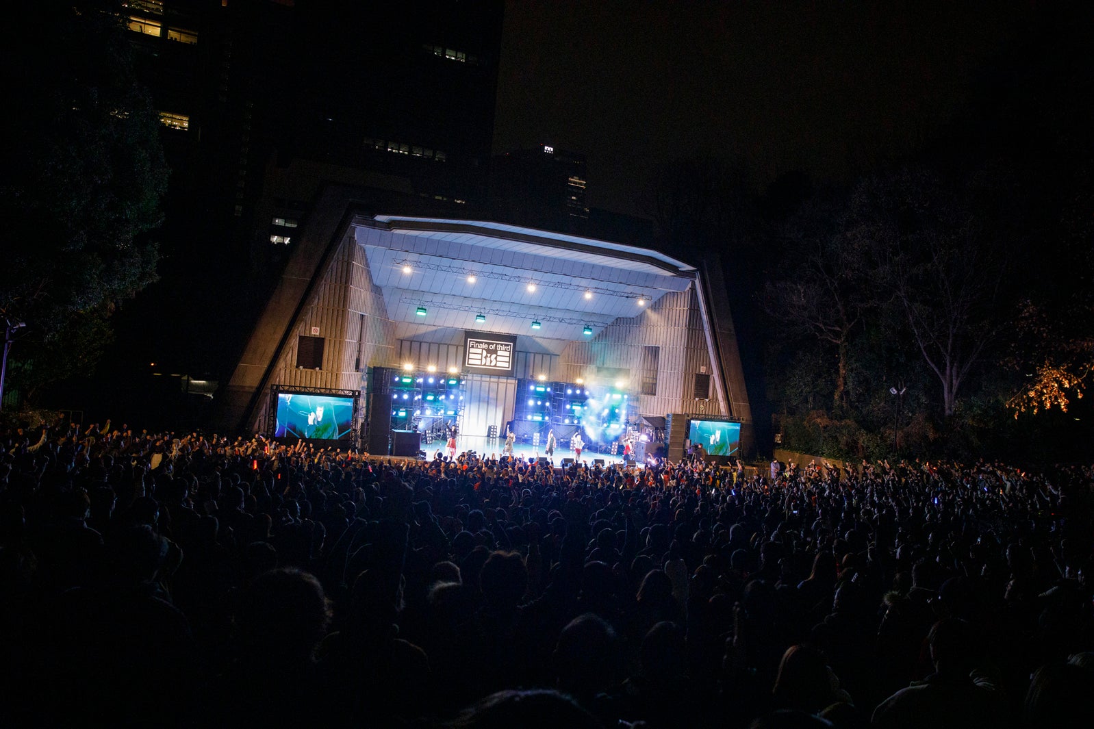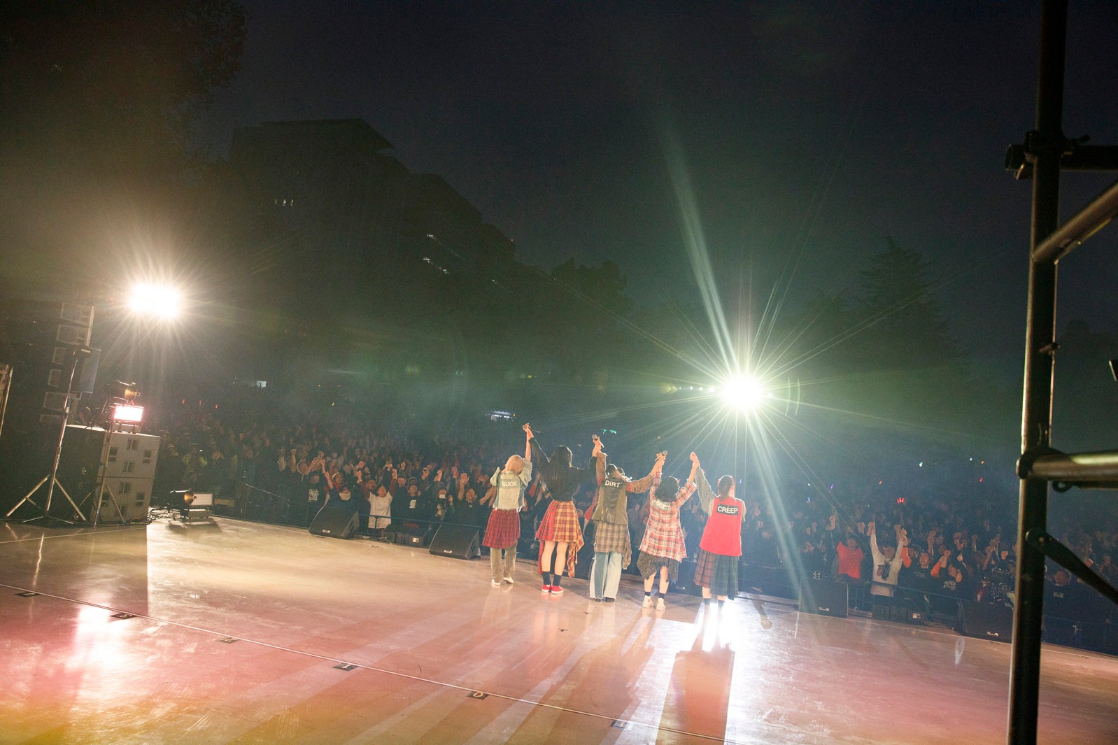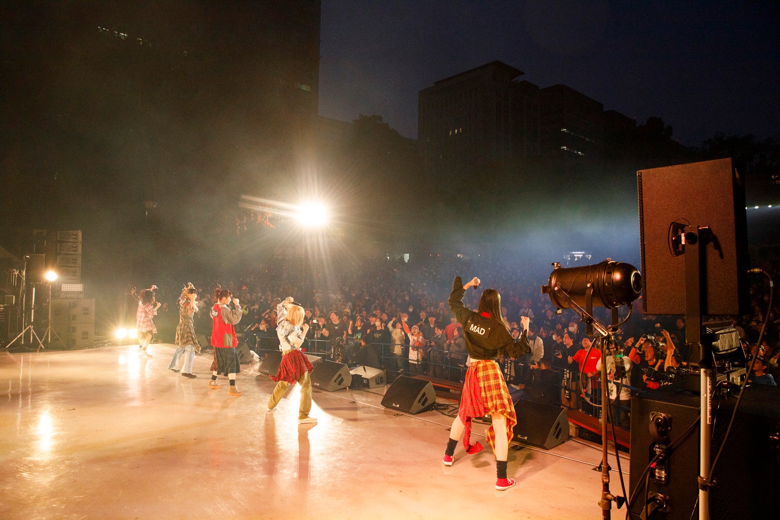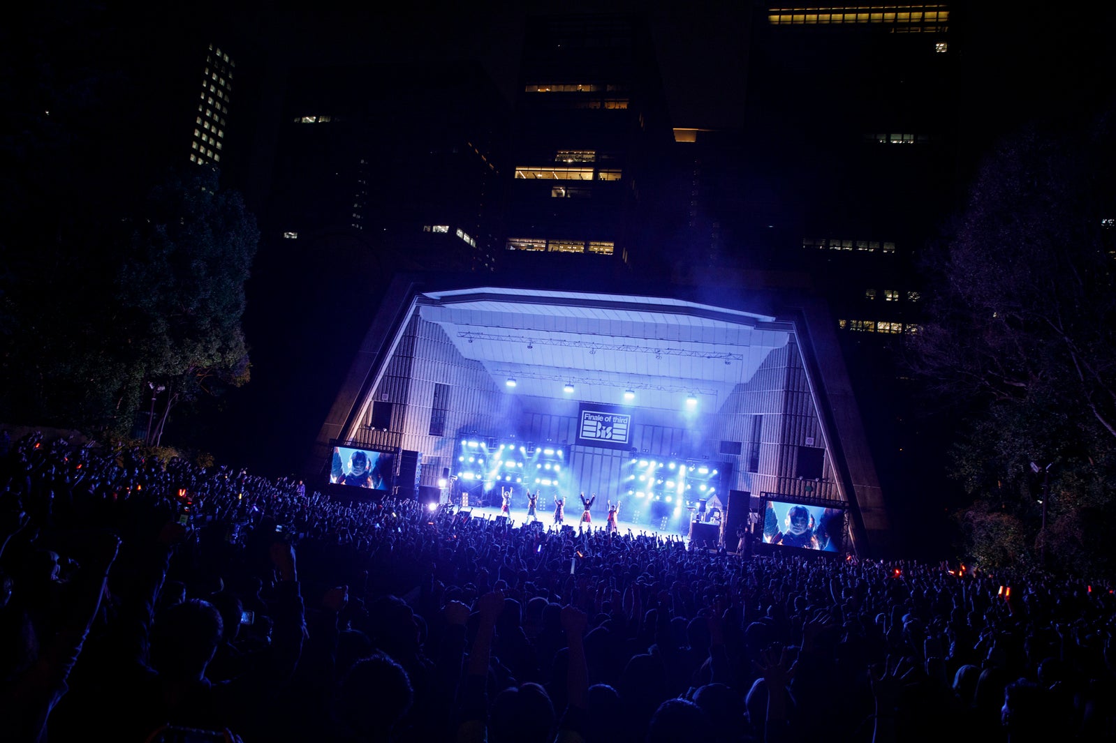 その後、第3期BiS名物の“スクワット”を取り入れた「thousand crickets」に突入。1月の寒空の中でも会場は熱気を帯び、日比谷野音が汗ばみ始めた。間髪入れず、イコ・ムゲンノカナタのシャウトが空間を切り裂くと「FUCKiNG OUT」でライブの勢いが増した。