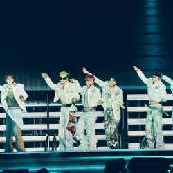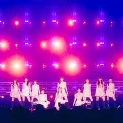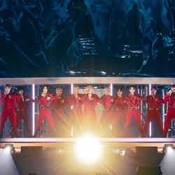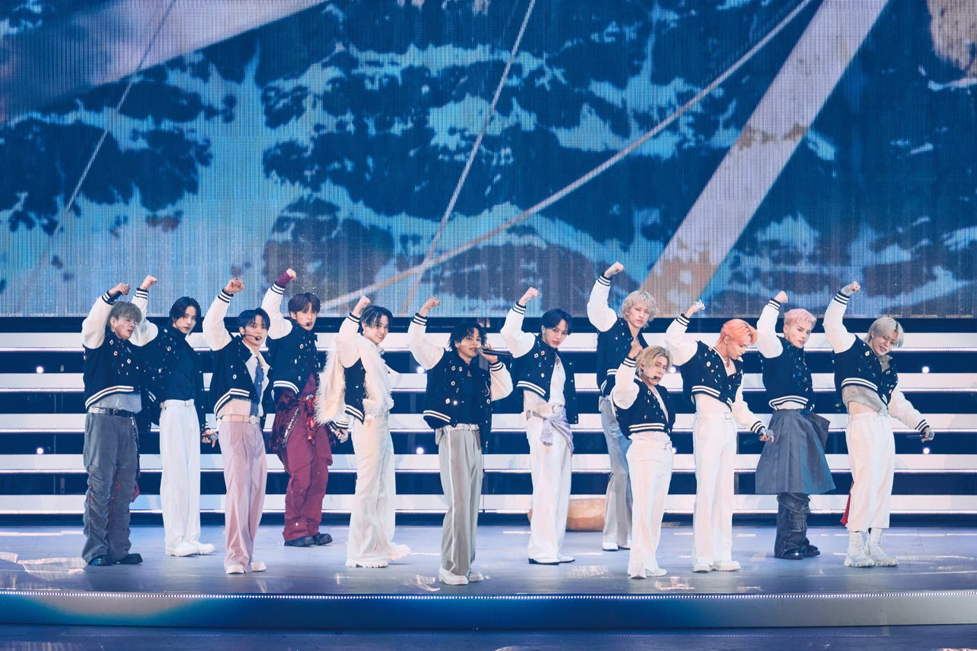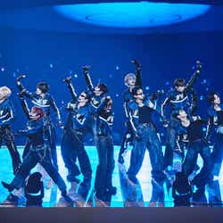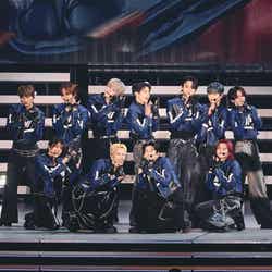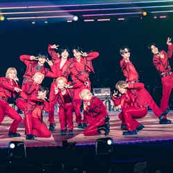 岡村はやりたかったというJO1の挨拶「Go to the TOP!JO1です」のJ“OKA”1バージョンをメンバーとやって満足気。さらに、『WOW WAR TONIGHT ~時には起こせよムーヴメント(JO1 ver.)』とイベントテーマソング『LOVE ALL STAR』を歌唱。鶴房のマイクを奪って睨み合いをするなど茶番も見せたが、最終的にはそれぞれのグループとダンスを踊り、最後に川尻蓮がウィッグを取って会場は笑いに包まれた。