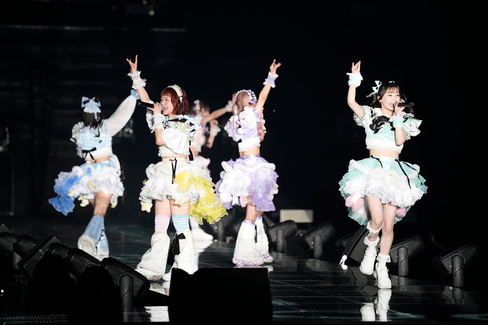 7人組アイドルグループ・ASPは、黒のレザー衣装で登場し「Tokyo Sky Blues」「TOXiC iNVASiON」を続けてパフォーマンス。歌い終えると「こんにちは~!」とテンション高めにセンターステージに現れ、「こ~んなでっかいステージでみなさんとライブできるの楽しみにしてきました!」と声を弾ませた。3曲目には「背景 ロックスター様」を披露し、メンバー、ファンともに拳を掲げたり、ヘッドバンギングをしたりとロックなステージを繰り広げた。次に登場したのは4人組アイドルグループ・ExWHYZ。ファンの熱いコールが印象的な「Dresscode」から始まり、2曲目には「NOT SORRY」を歌唱。エモーショナルな歌詞の「ドラマ」、前向きで爽やかな「STAY WITH Me」をしっとりと聴かせ、メンバーがステージの端まで行き、会場全体へ思いを届けた。